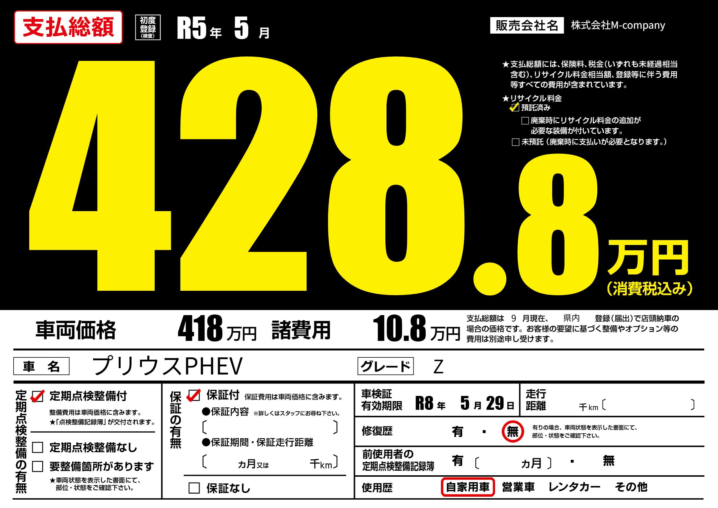 | 車名 | プリウスPHEV | グレード ミッション 排気量 |