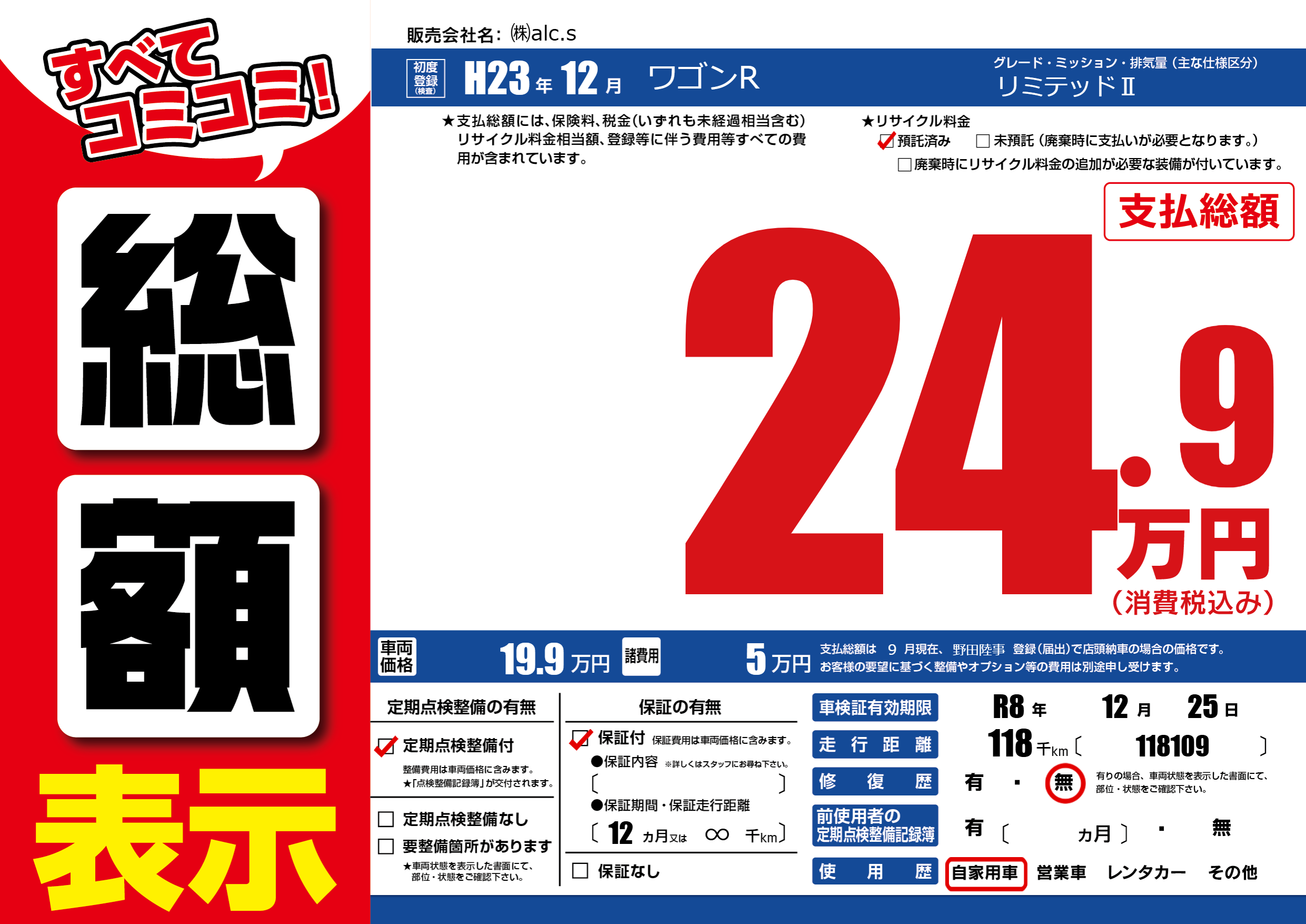 | 走行キロ | 11.8万km | 初年度登録 | H23年12月 |