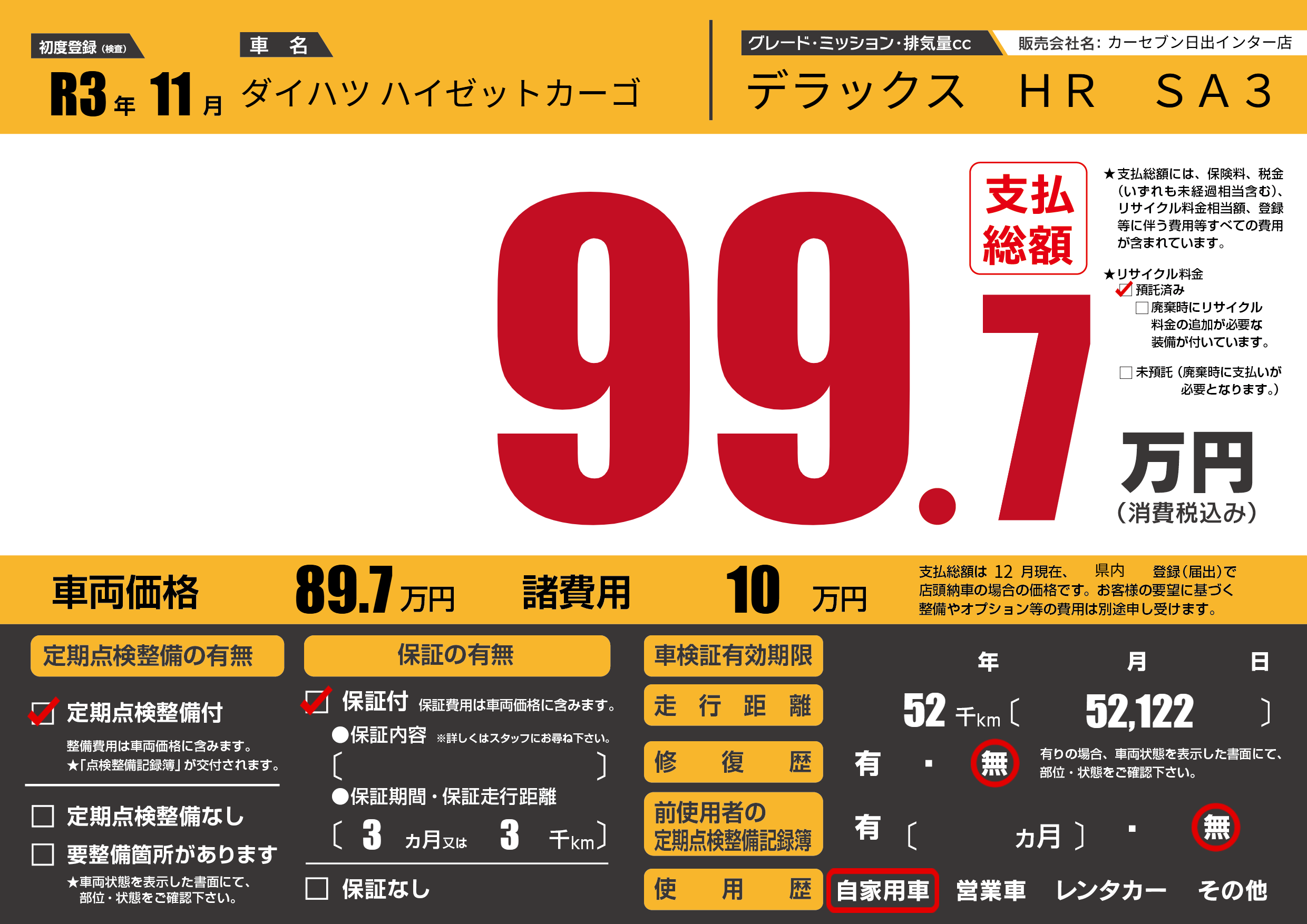 | 車名 | ダイハツ ハイゼットカーゴ | グレード ミッション 排気量 |