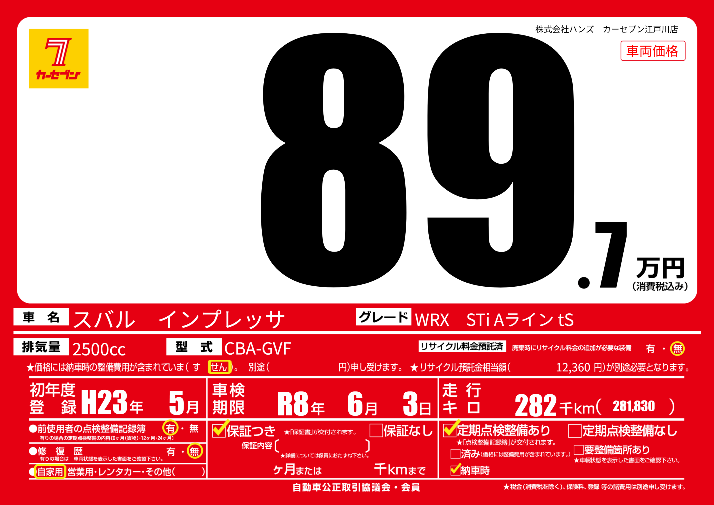 | 車名 | スバル インプレッサ | グレード ミッション 排気量 |