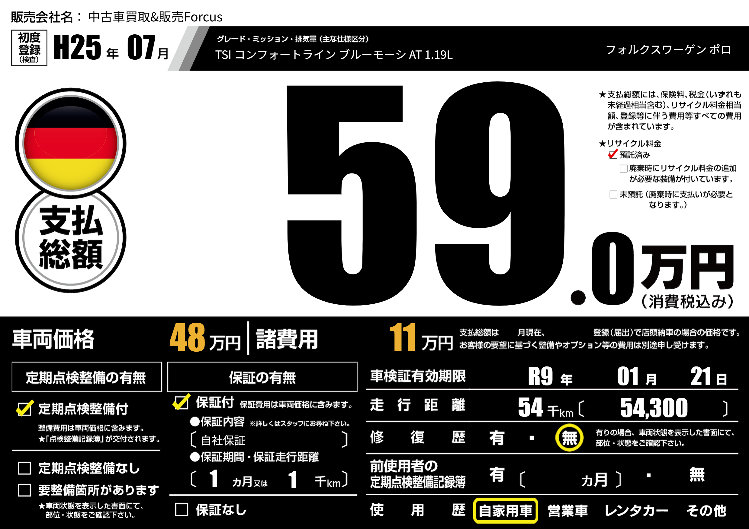 | 車名 | フォルクスワーゲン ポロ | グレード ミッション 排気量 |