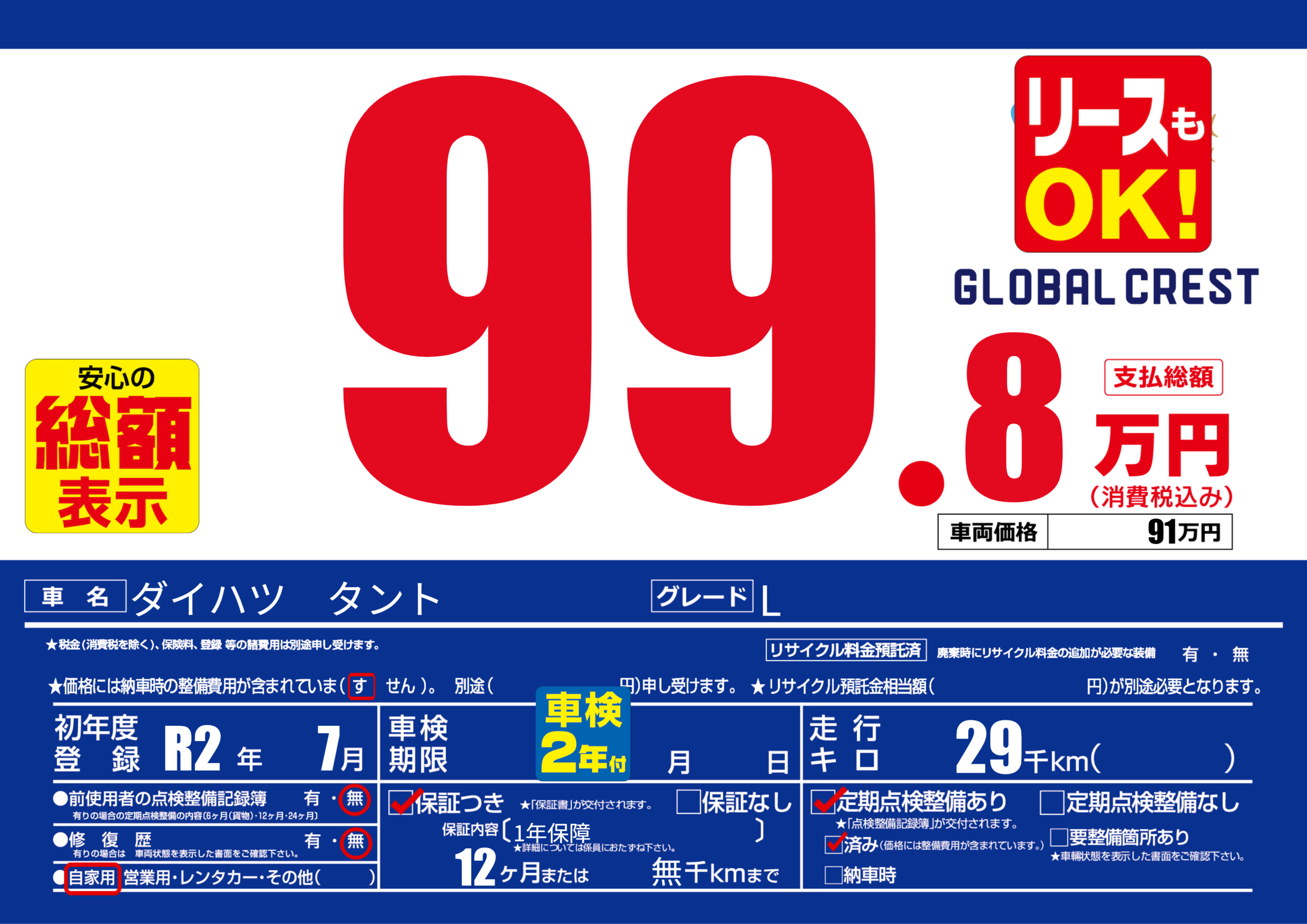 | 定期点検整備 | 定期点検整備あり 定期点検整備済み | ||