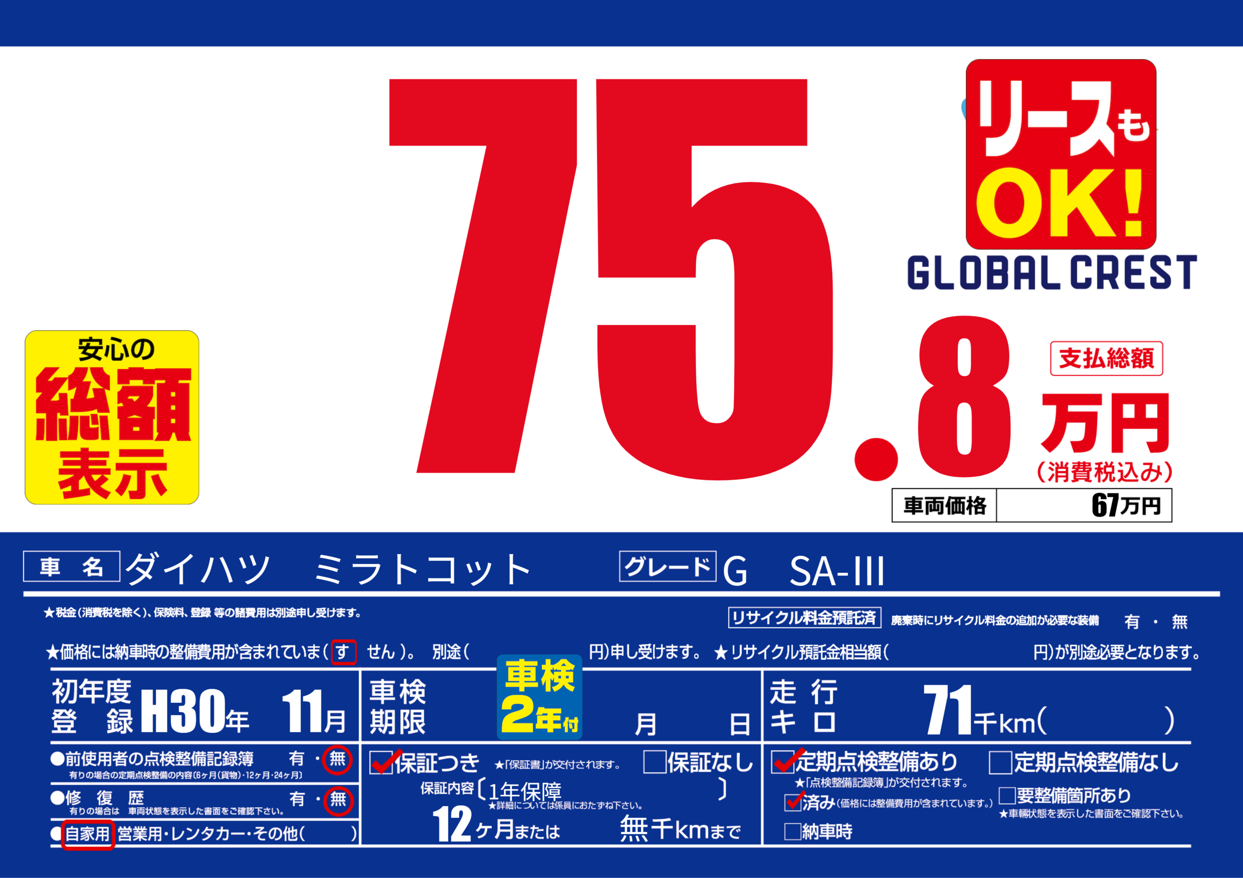 | 定期点検整備 | 定期点検整備あり 定期点検整備済み | ||