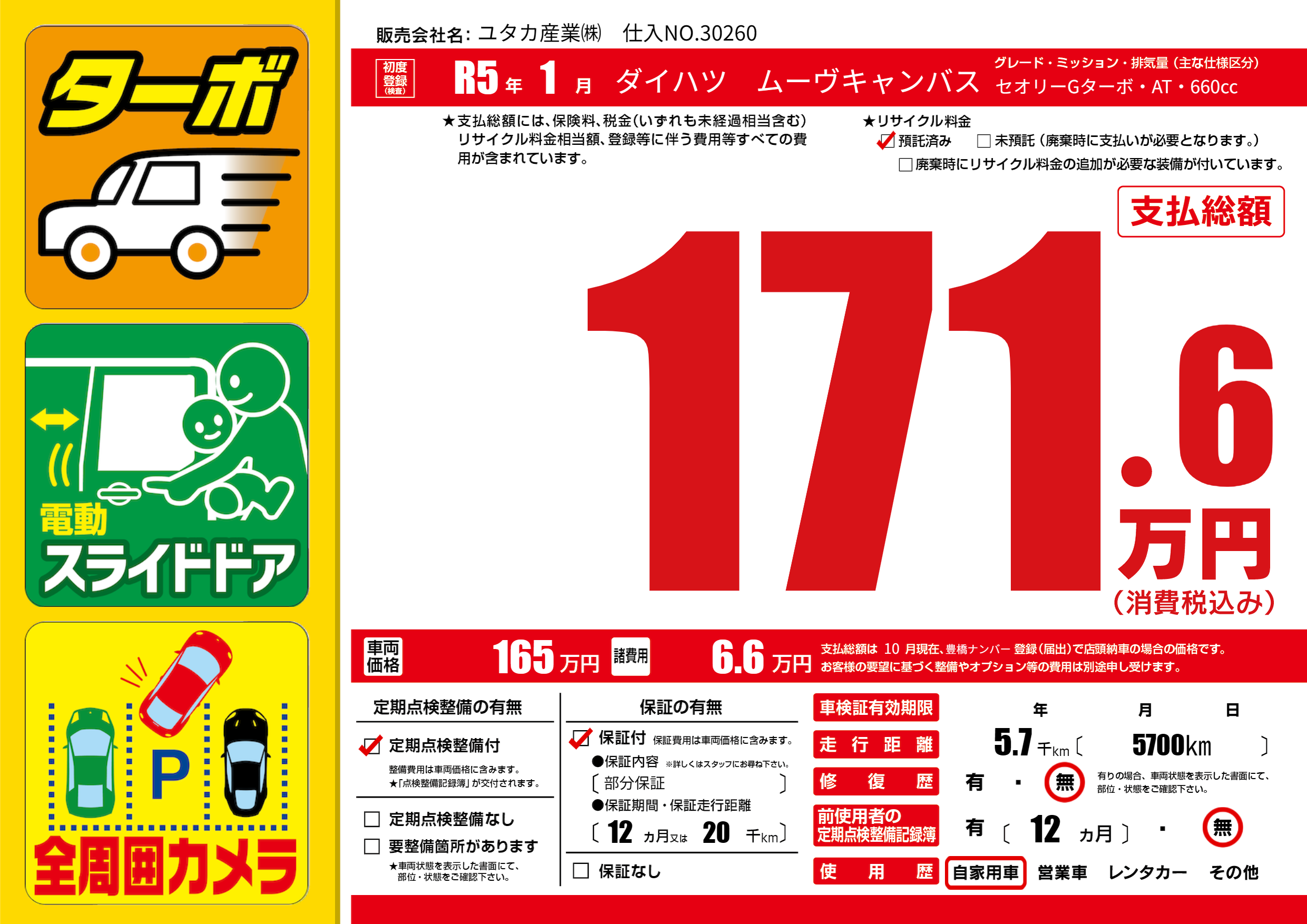 | 走行キロ | 0.5万km | 初年度登録 | R5年1月 |