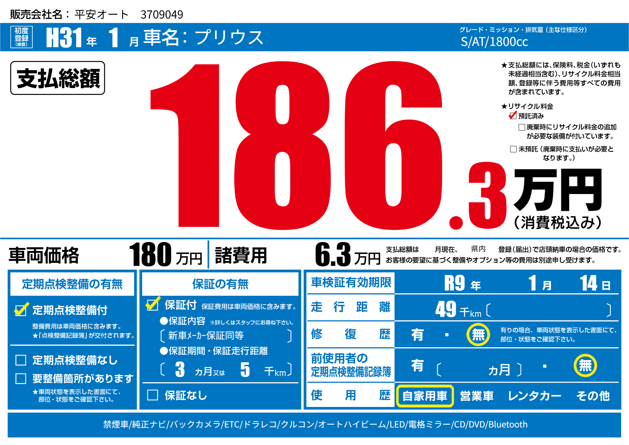 | 車名 | プリウス | グレード ミッション 排気量 |
