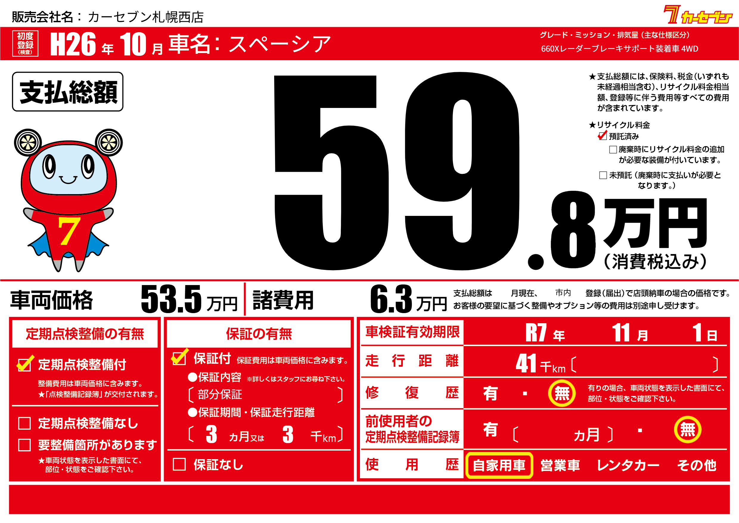 | 走行キロ | 4.1万km | 初年度登録 | H26年10月 |