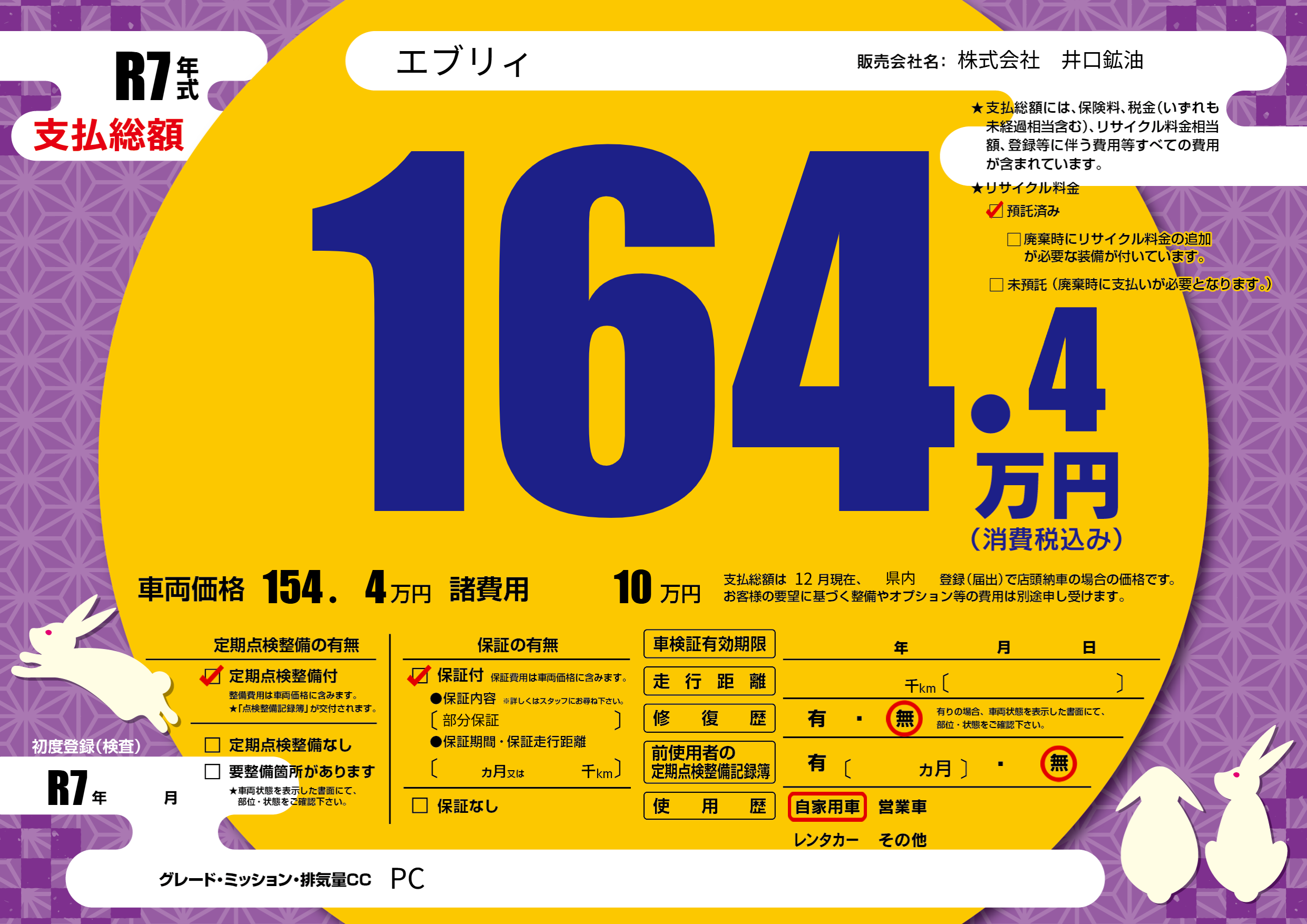| 車名 | エブリィ | グレード ミッション 排気量 |