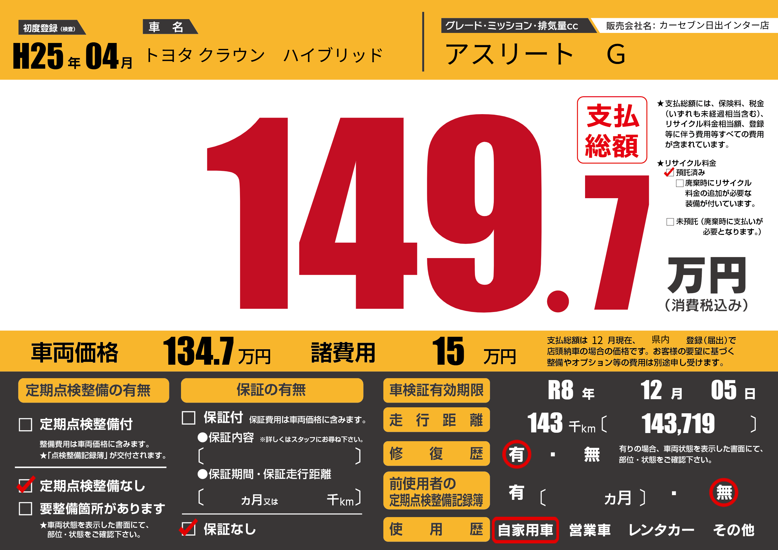 | 車名 | トヨタ クラウン ハイブリッド | グレード ミッション 排気量 |