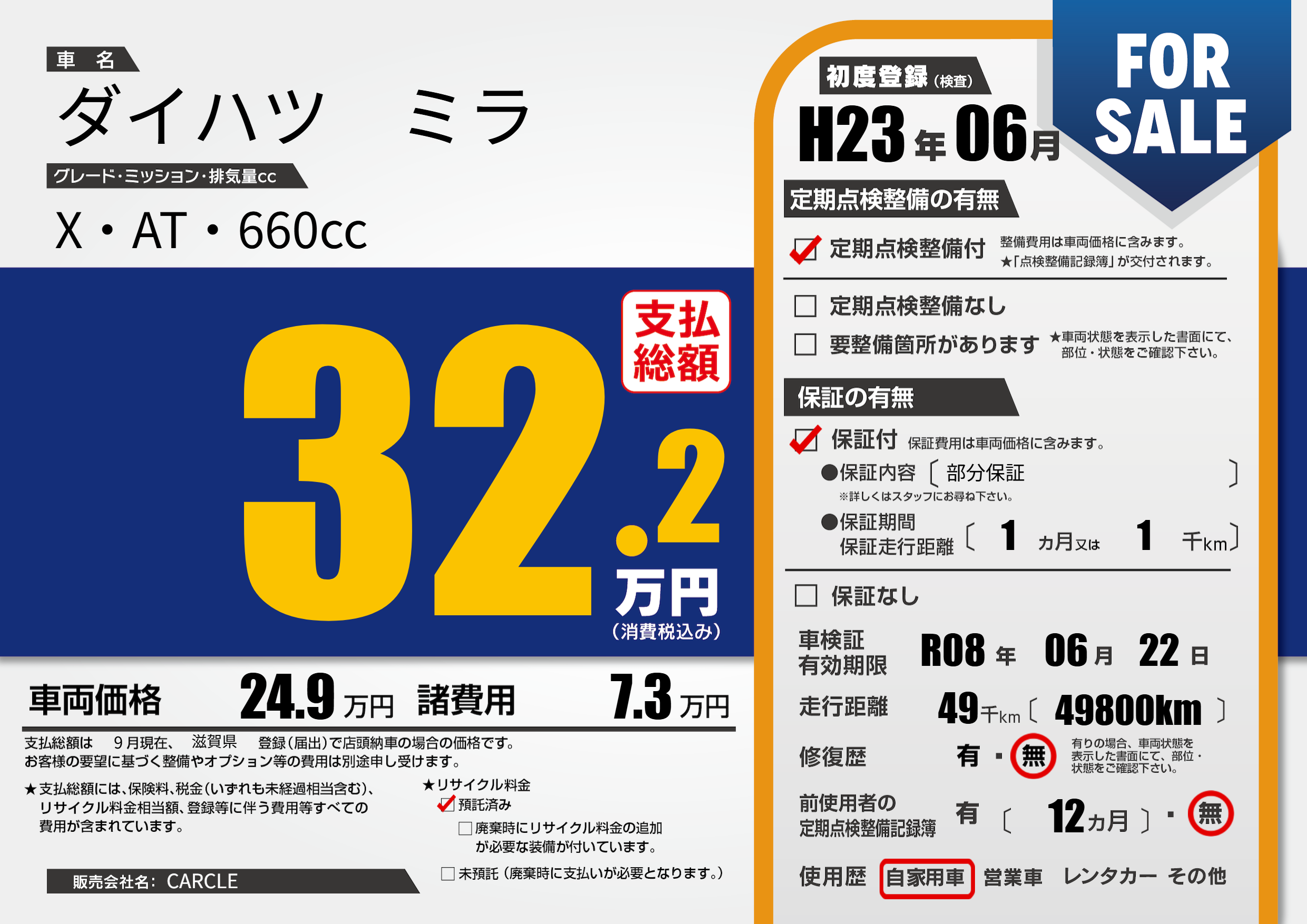 | 走行キロ | 4.9万km | 初年度登録 | H23年06月 |