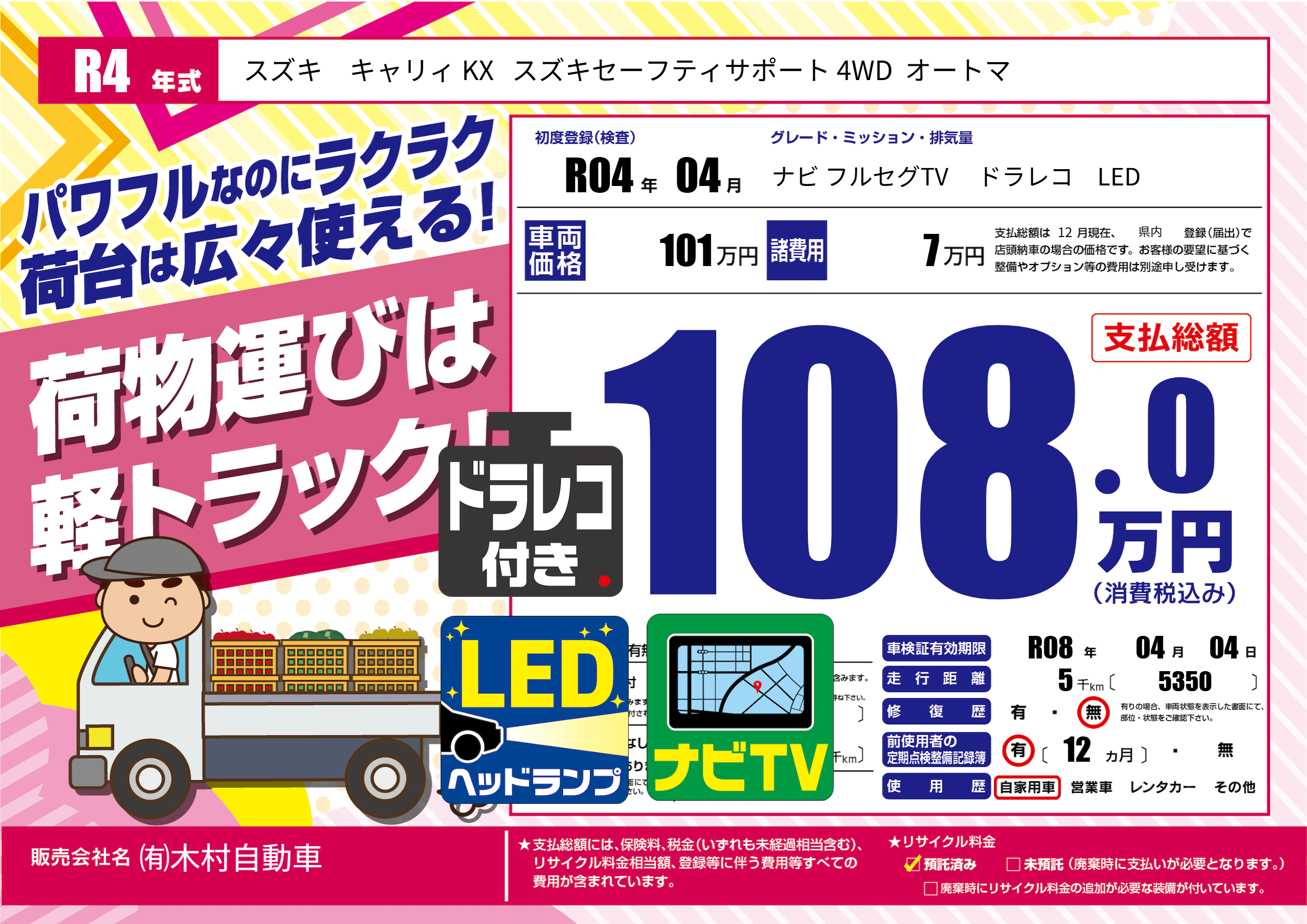 | 車名 | スズキ キャリィ KX スズキセーフティサポート 4WD オートマ | グレード ミッション 排気量 |