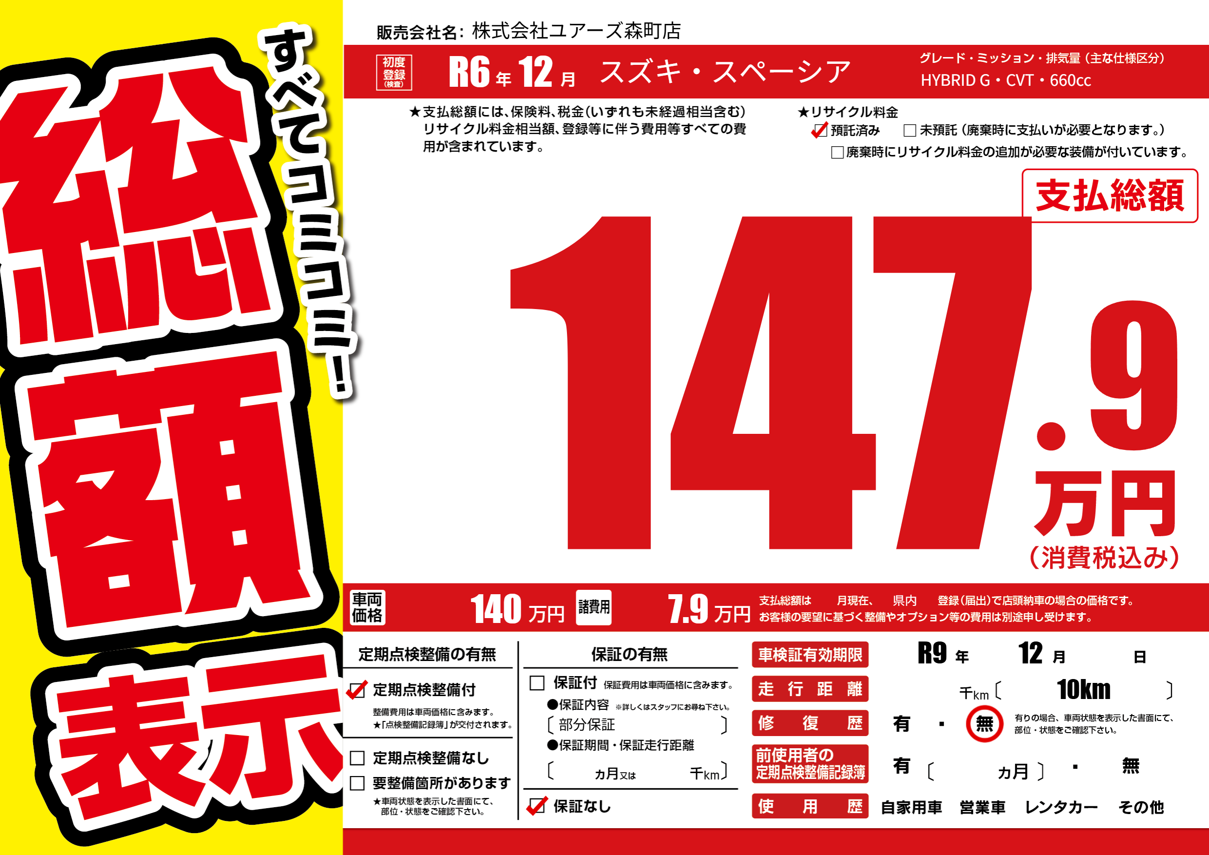 | 車名 | スズキ・スペーシア | グレード ミッション 排気量 |