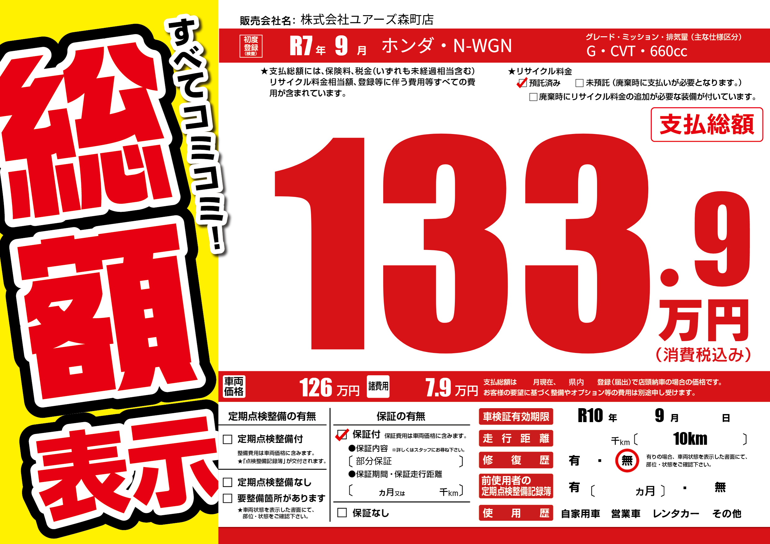 | 車名 | ホンダ・N-WGN | グレード ミッション 排気量 |