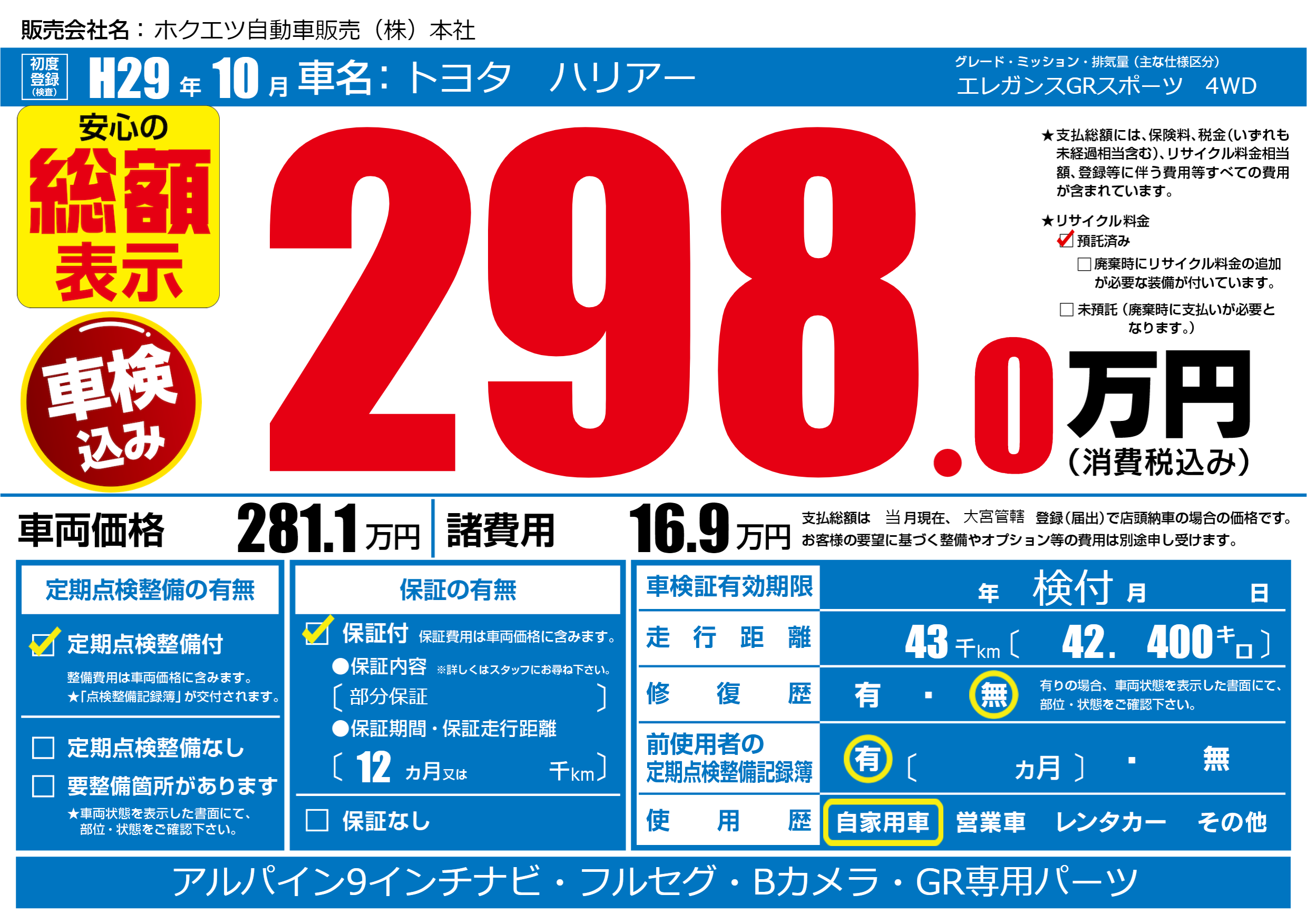 | 走行キロ | 4.3万km | 初年度登録 | H29年10月 |
