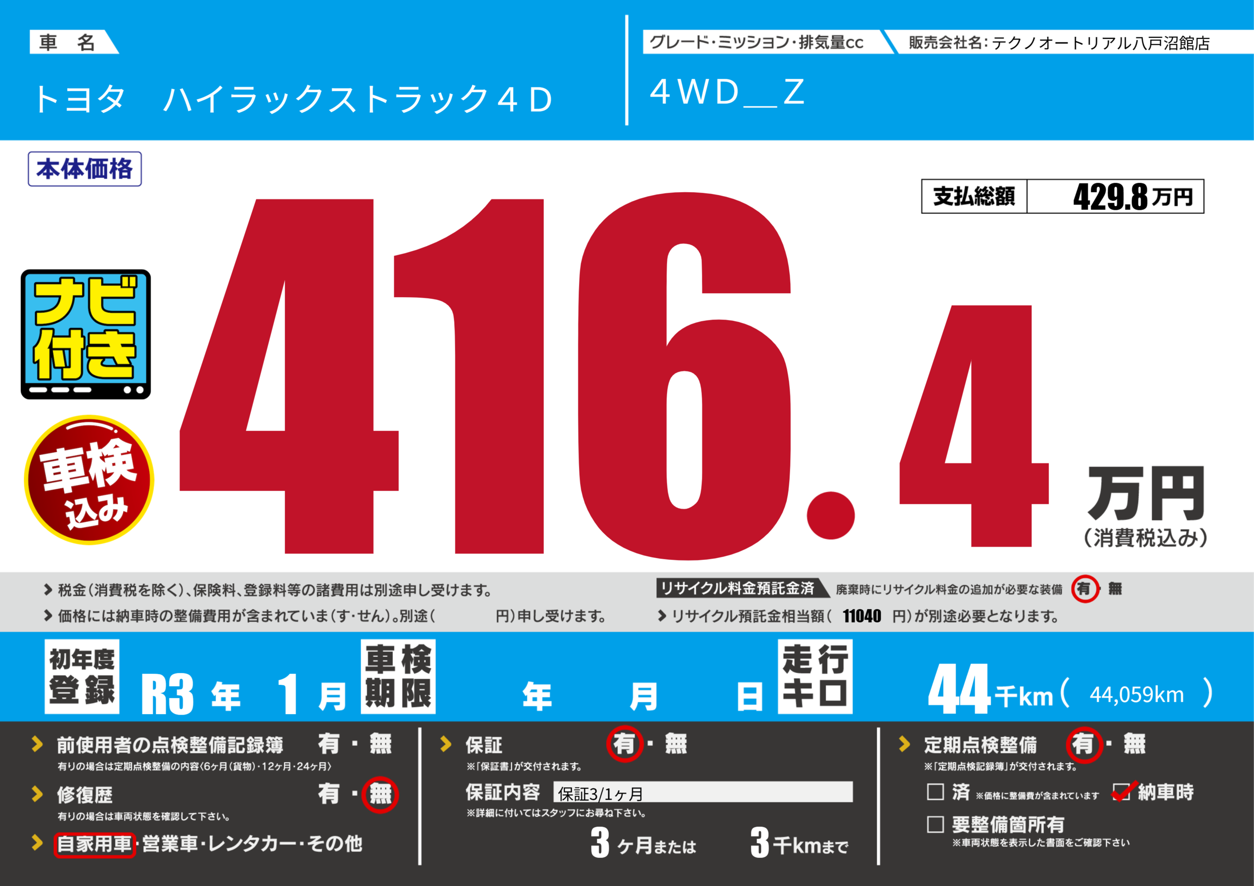 | 走行キロ | 4.4万km | 初年度登録 | R3年1月 |