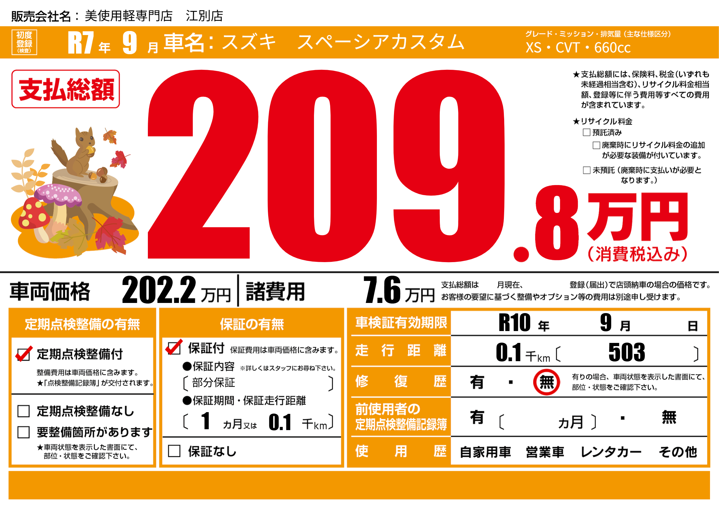| 走行キロ | - | 初年度登録 | R7年9月 |