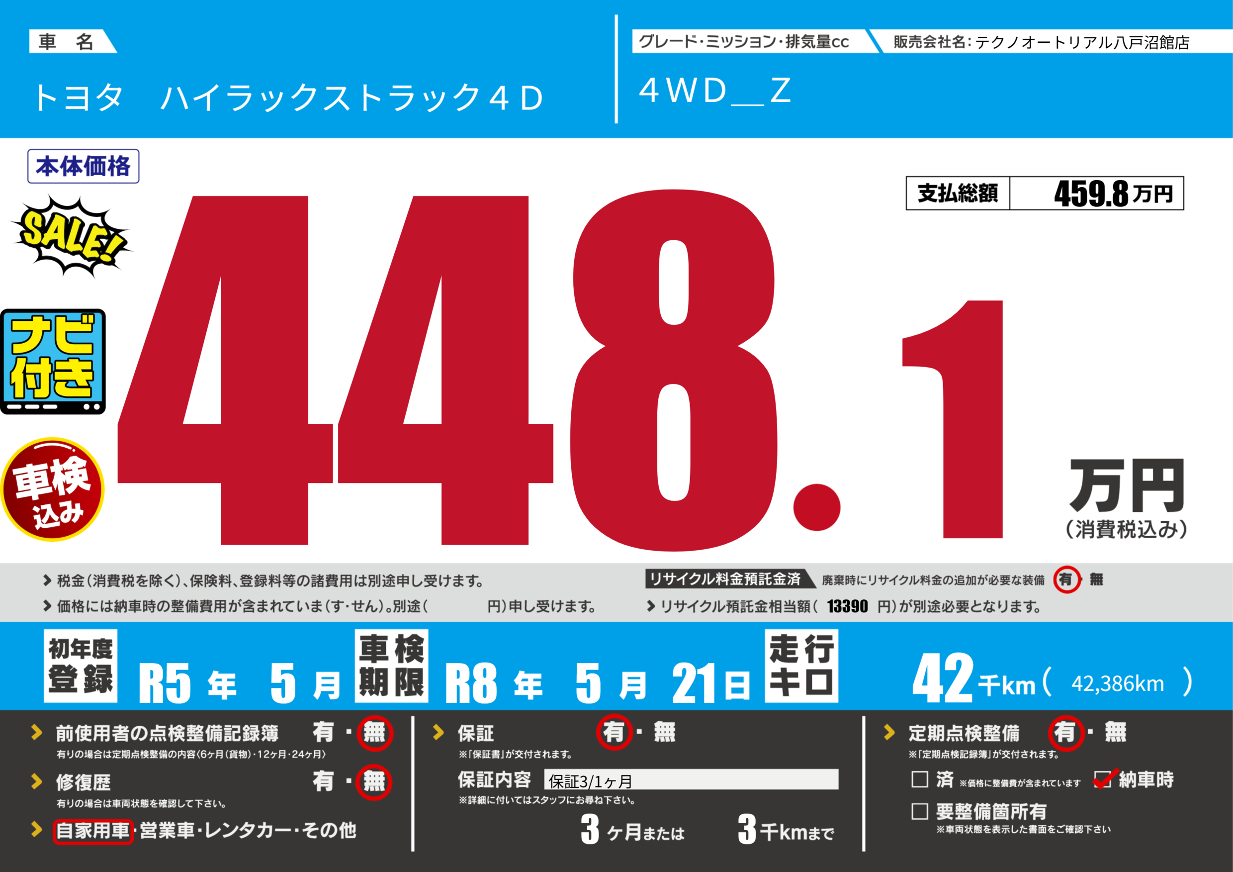 | 走行キロ | 4.2万km | 初年度登録 | R5年5月 |