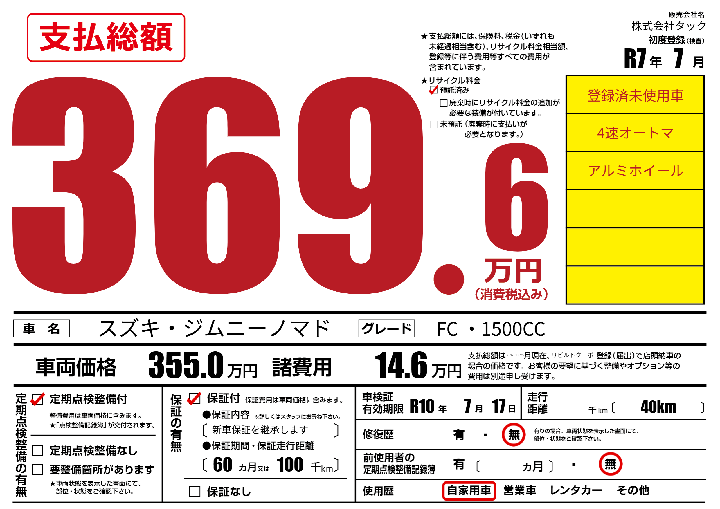 | 走行キロ | - | 初年度登録 | R7年7月 |