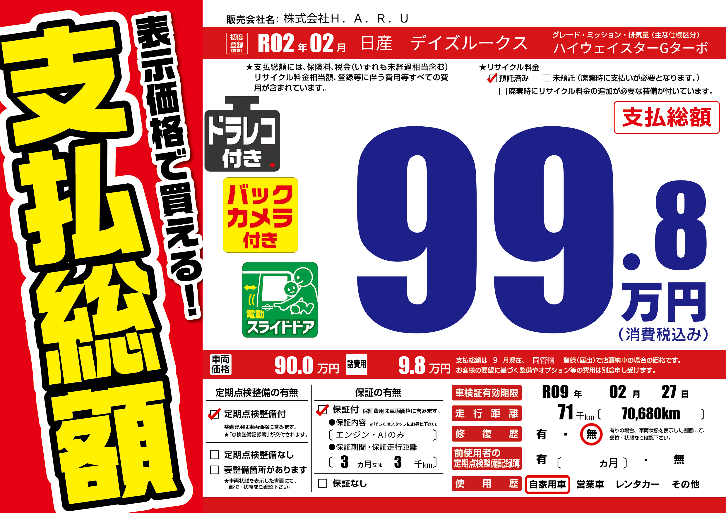 | 車名 | 日産 デイズルークス | グレード ミッション 排気量 |