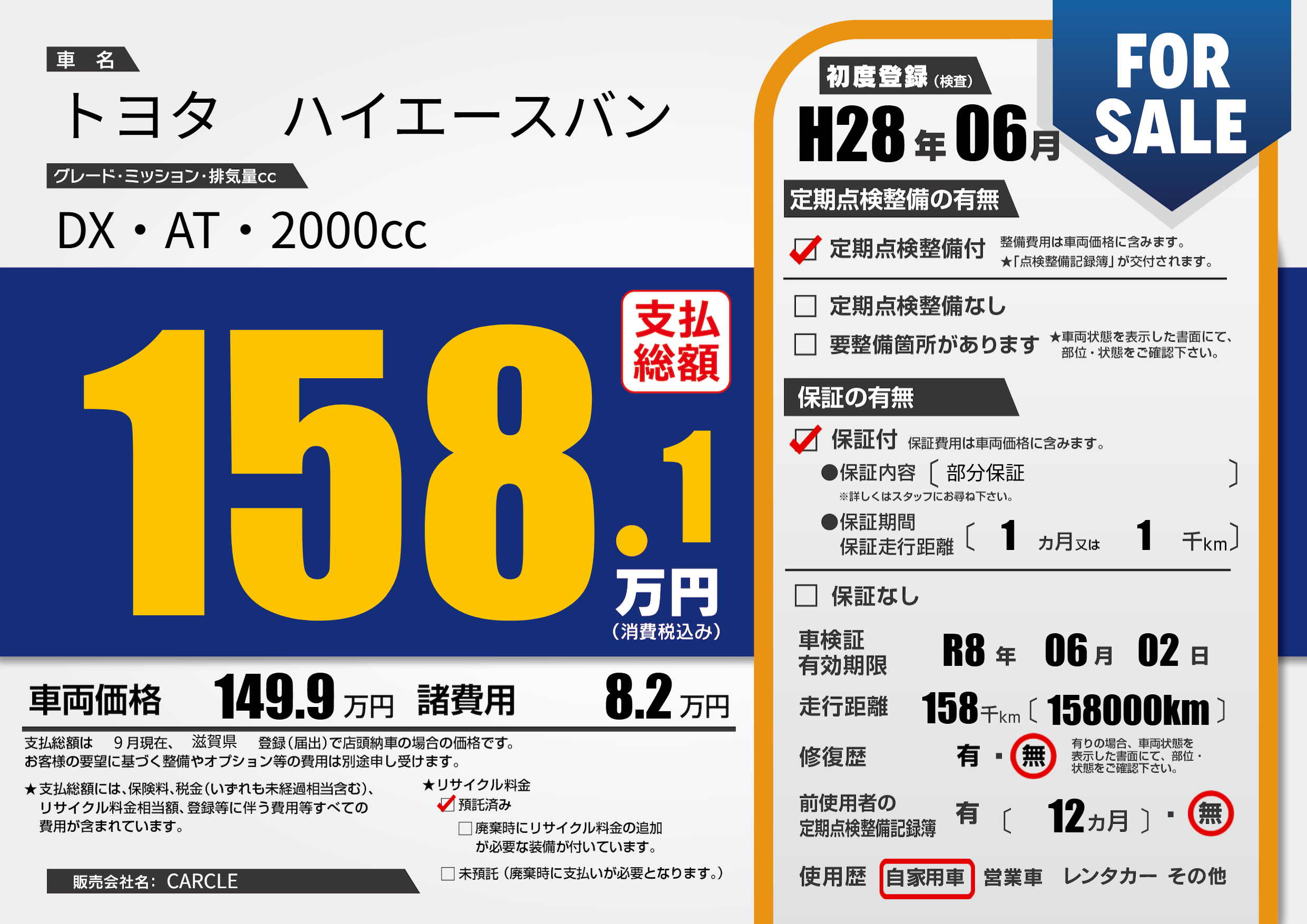 | 走行キロ | 15.8万km | 初年度登録 | H28年06月 |