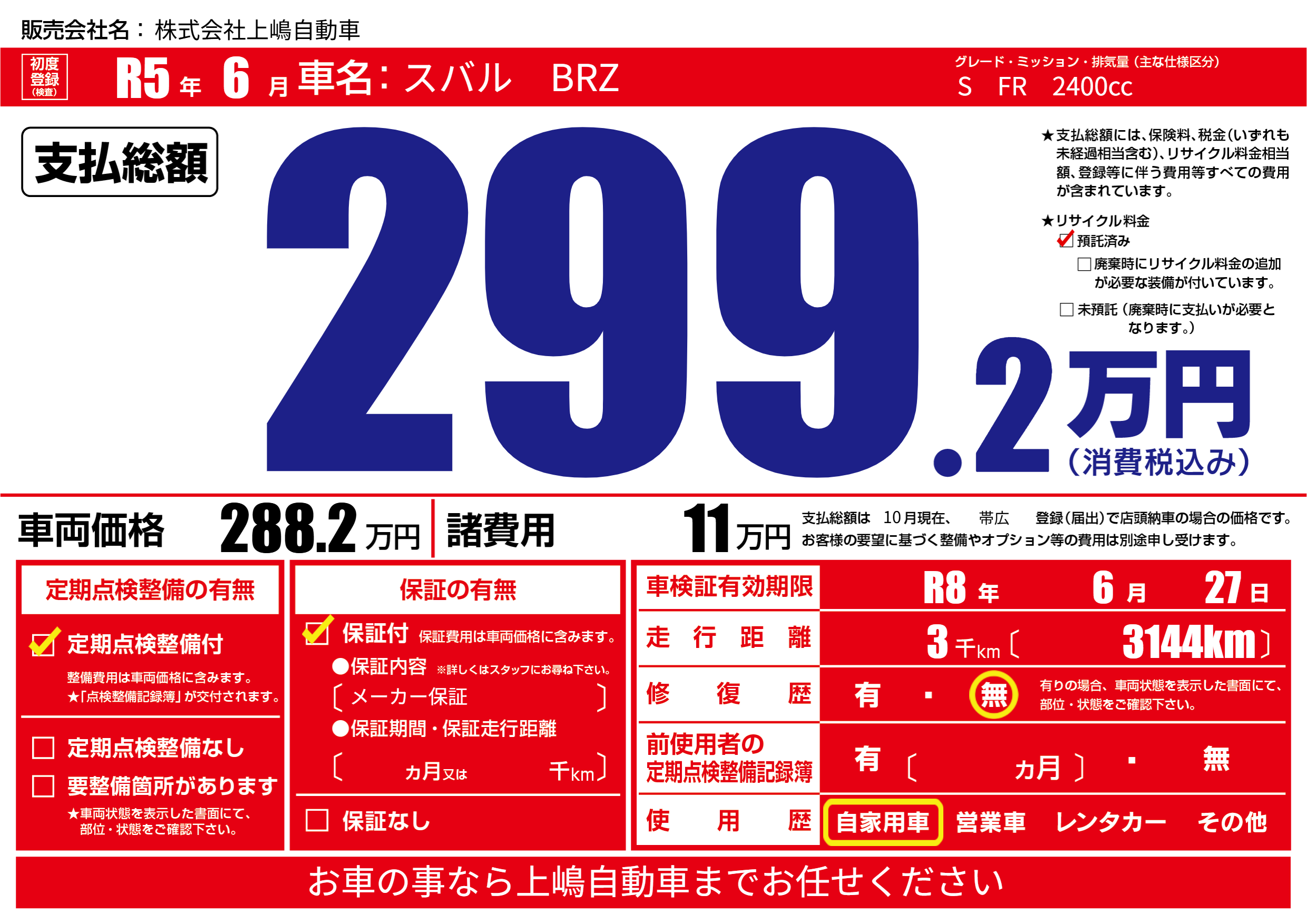 | 車名 | スバル BRZ | グレード ミッション 排気量 |
