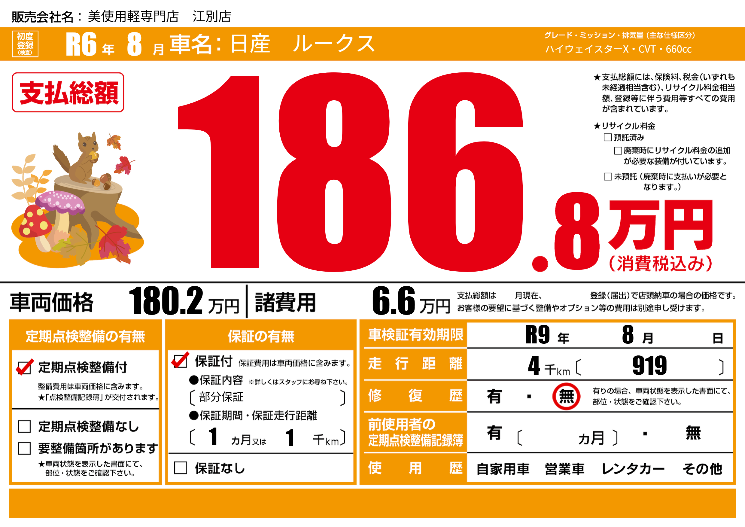 | 走行キロ | 0.4万km | 初年度登録 | R6年8月 |