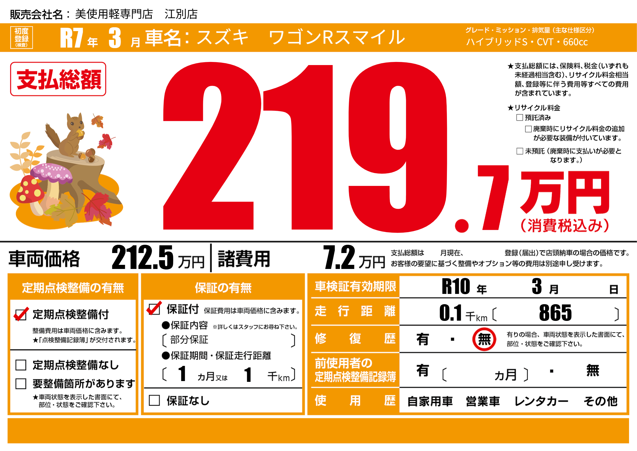 | 車検制限 | R10年 3月 - 日 | ||