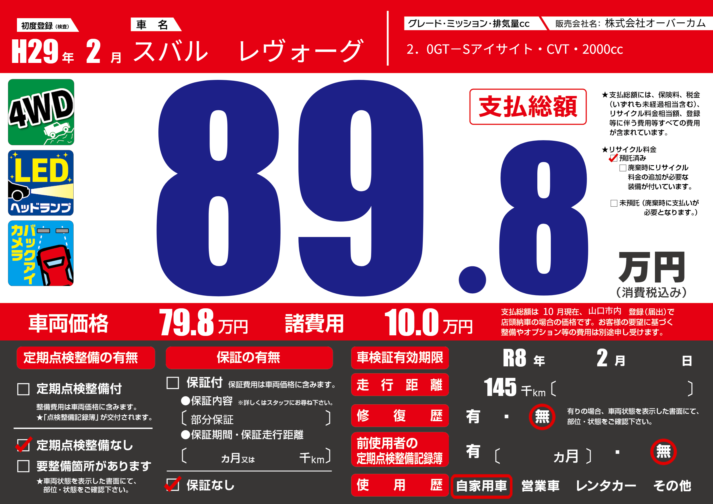 | 車名 | スバル レヴォーグ | グレード ミッション 排気量 |