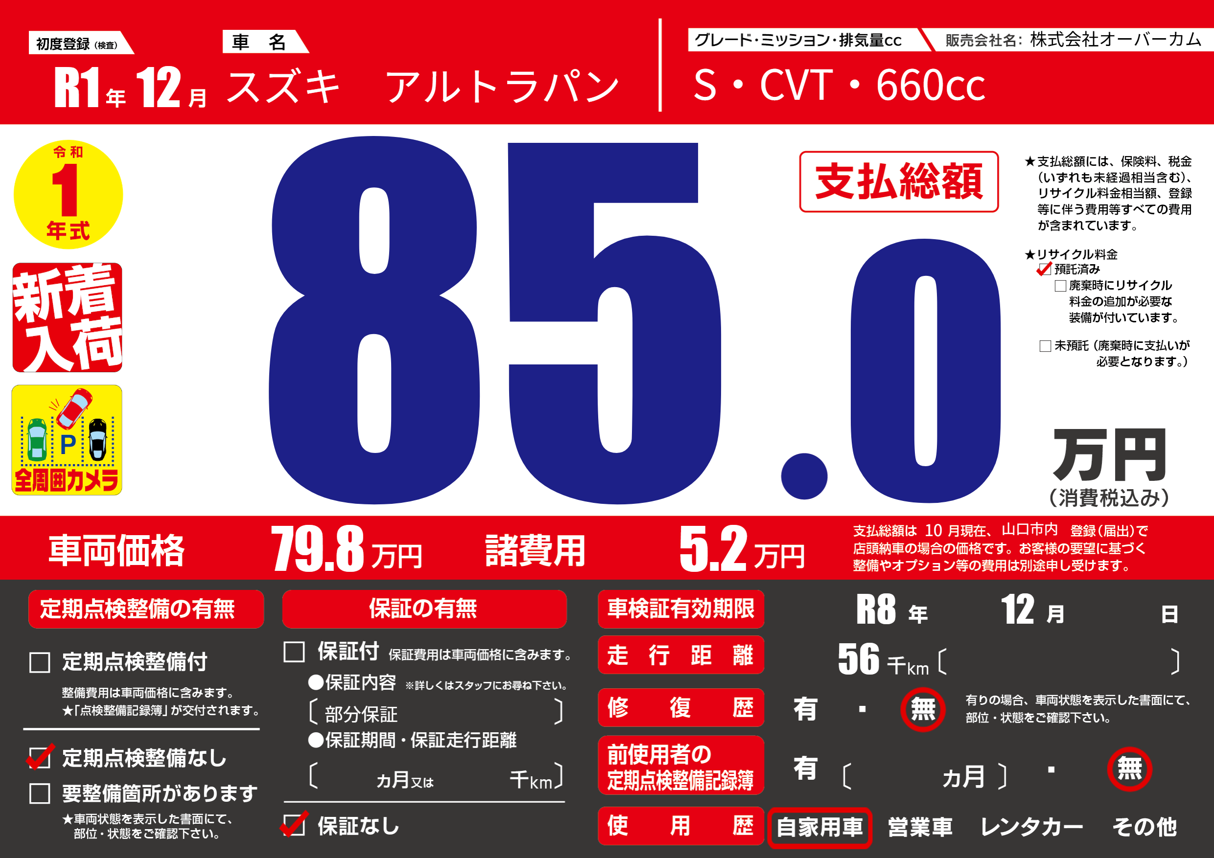 | 走行キロ | 5.6万km | 初年度登録 | R1年12月 |