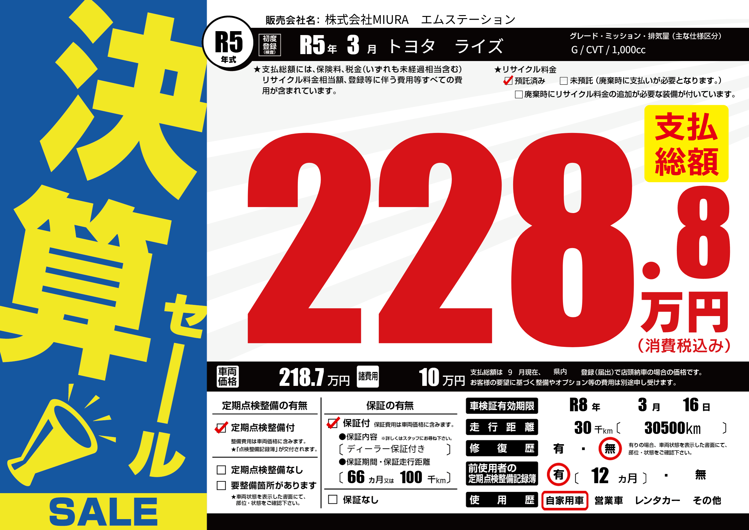 | 走行キロ | 3万km | 初年度登録 | R5年3月 |