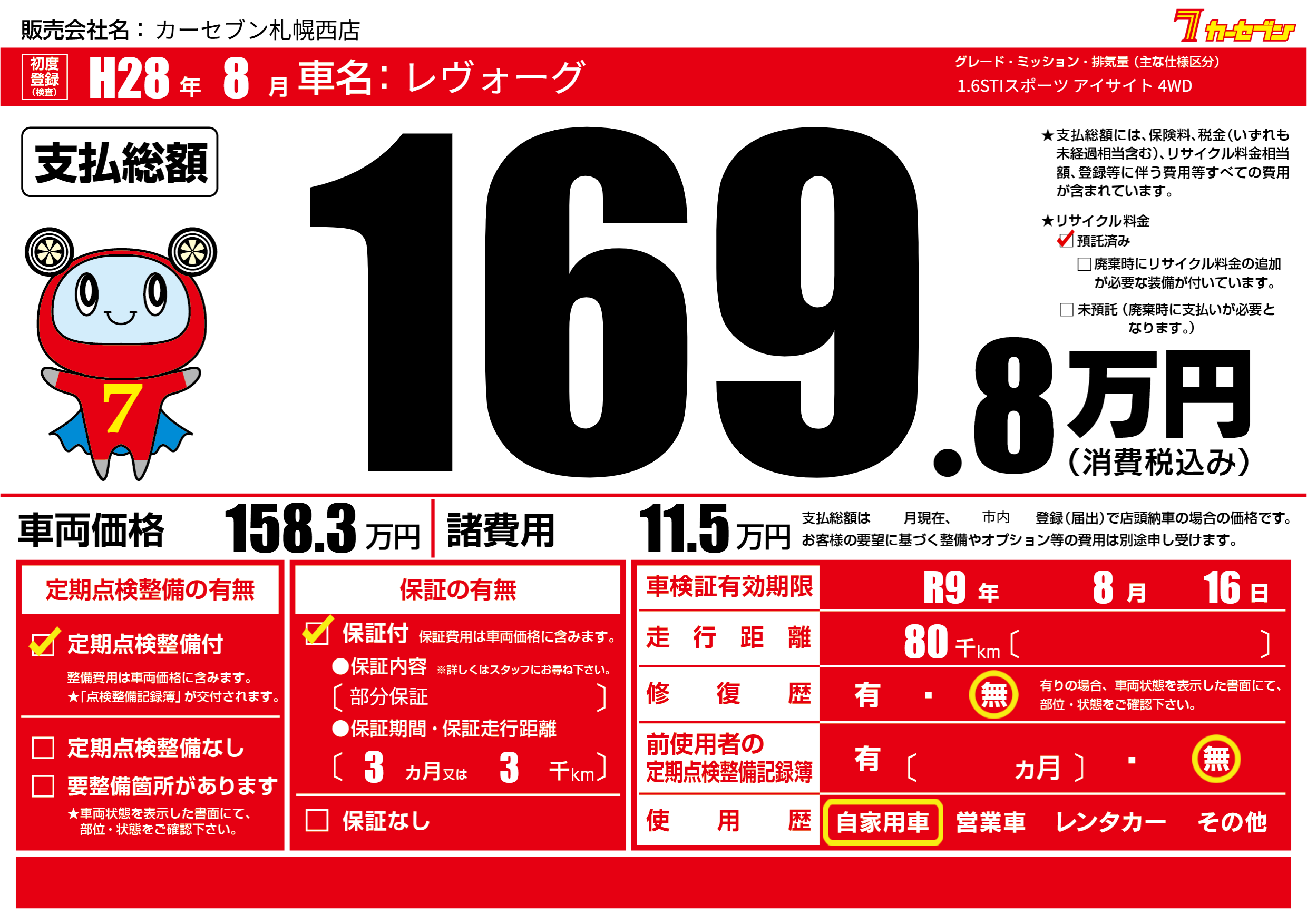 | 走行キロ | 8万km | 初年度登録 | H28年8月 |