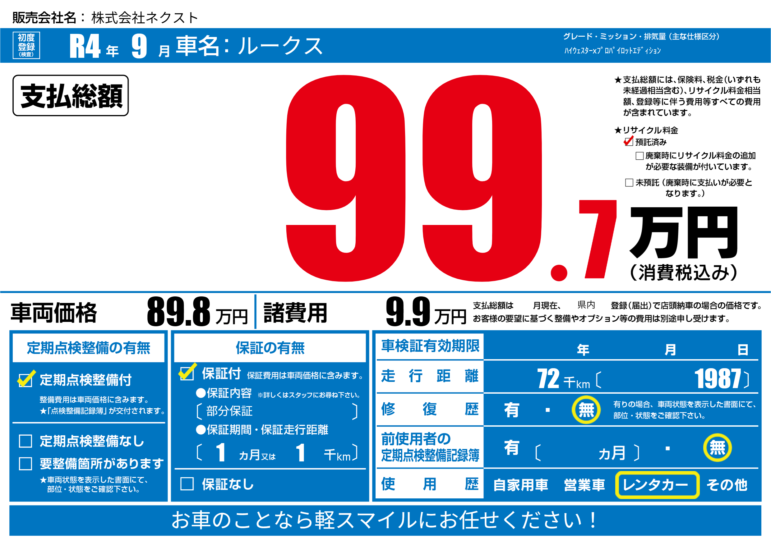 | 走行キロ | 7.2万km | 初年度登録 | R4年9月 |