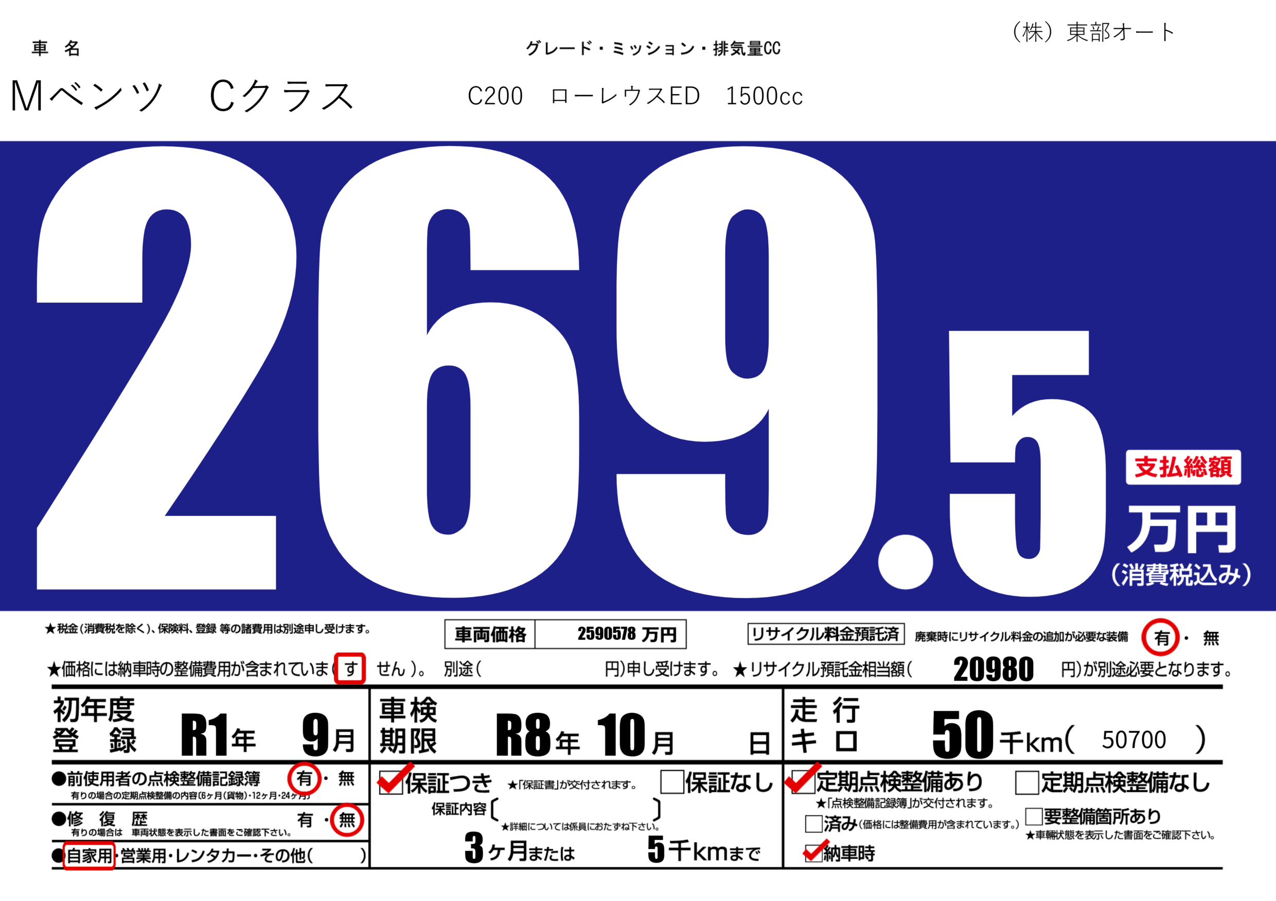 | 車名 | Mベンツ Cクラス | グレード ミッション 排気量 |