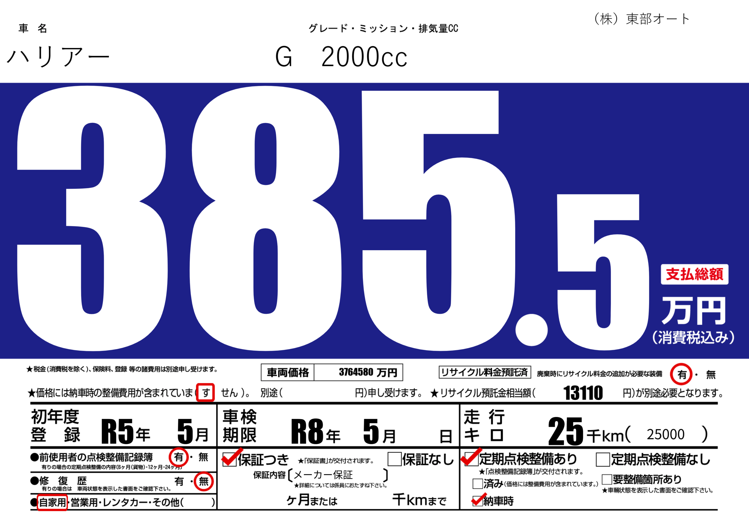 | 車名 | ハリアー | グレード ミッション 排気量 |