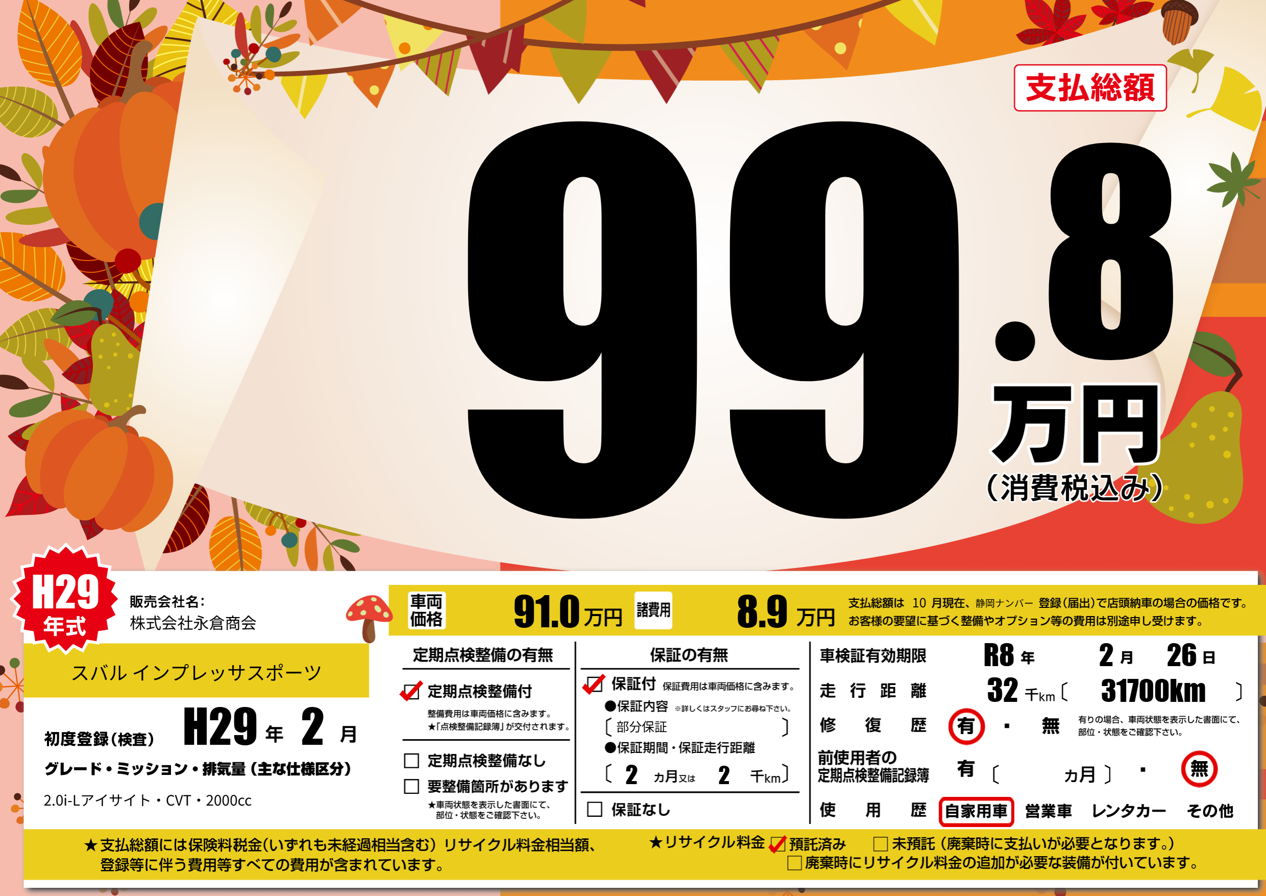 | 車名 | スバル インプレッサスポーツ | グレード ミッション 排気量 |