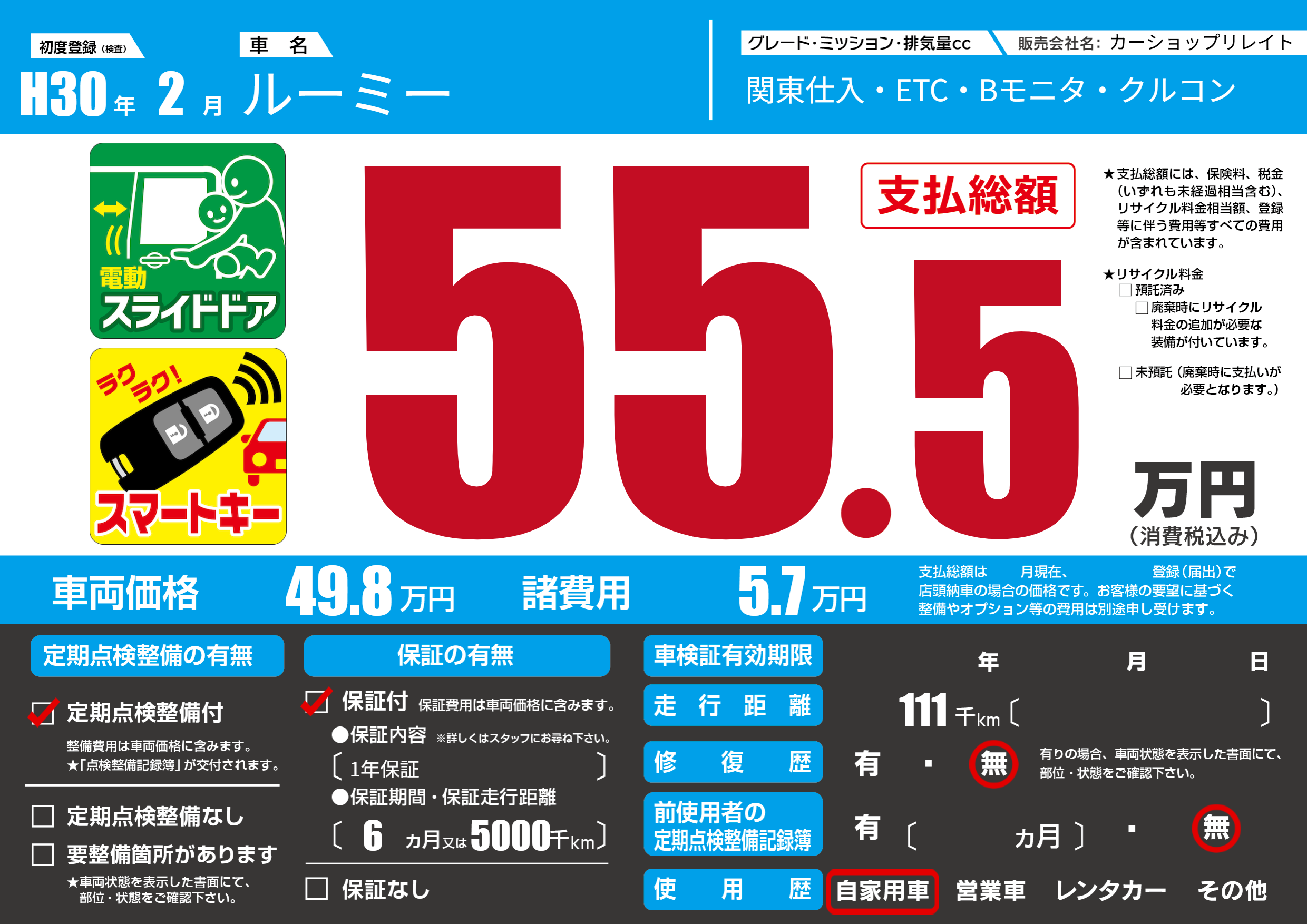 | 車名 | ルーミー | グレード ミッション 排気量 |
