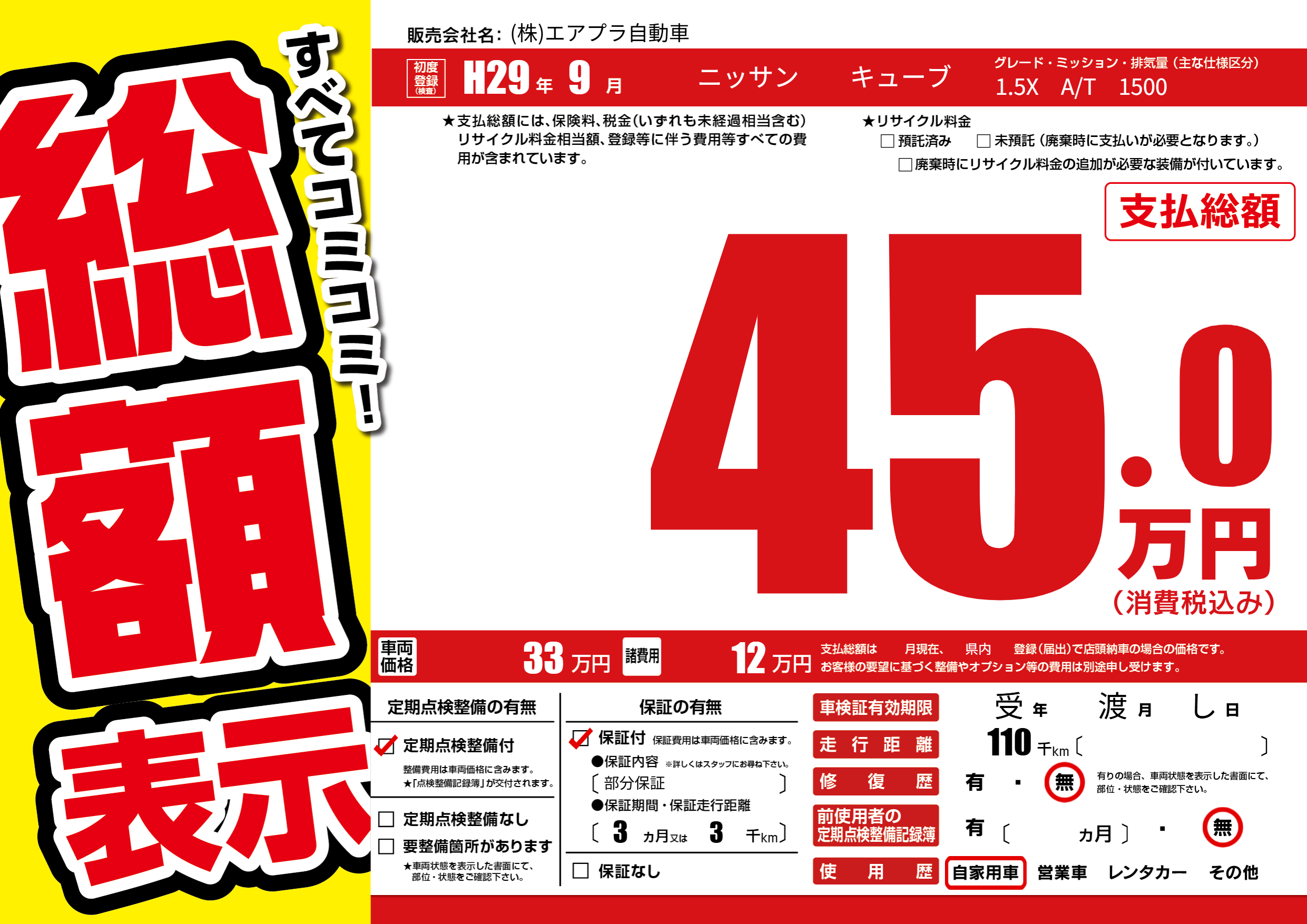 | 走行キロ | 11万km | 初年度登録 | H29年9月 |