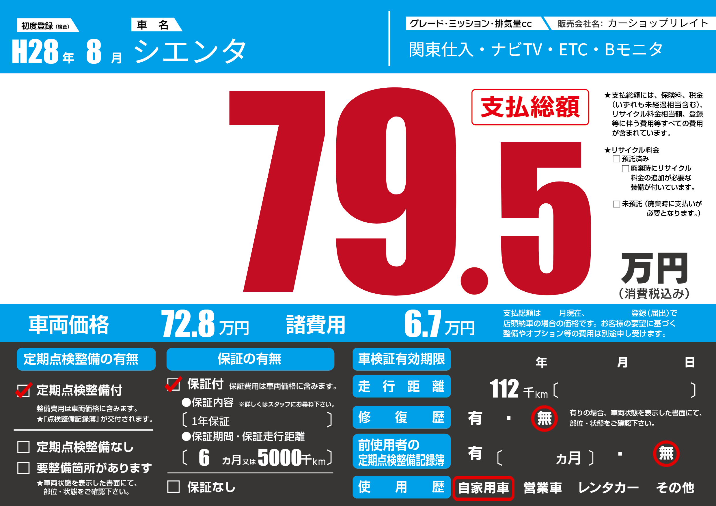 保証付き 保証内容(1年保証) 6ヶ月または(5000)千kmまで |