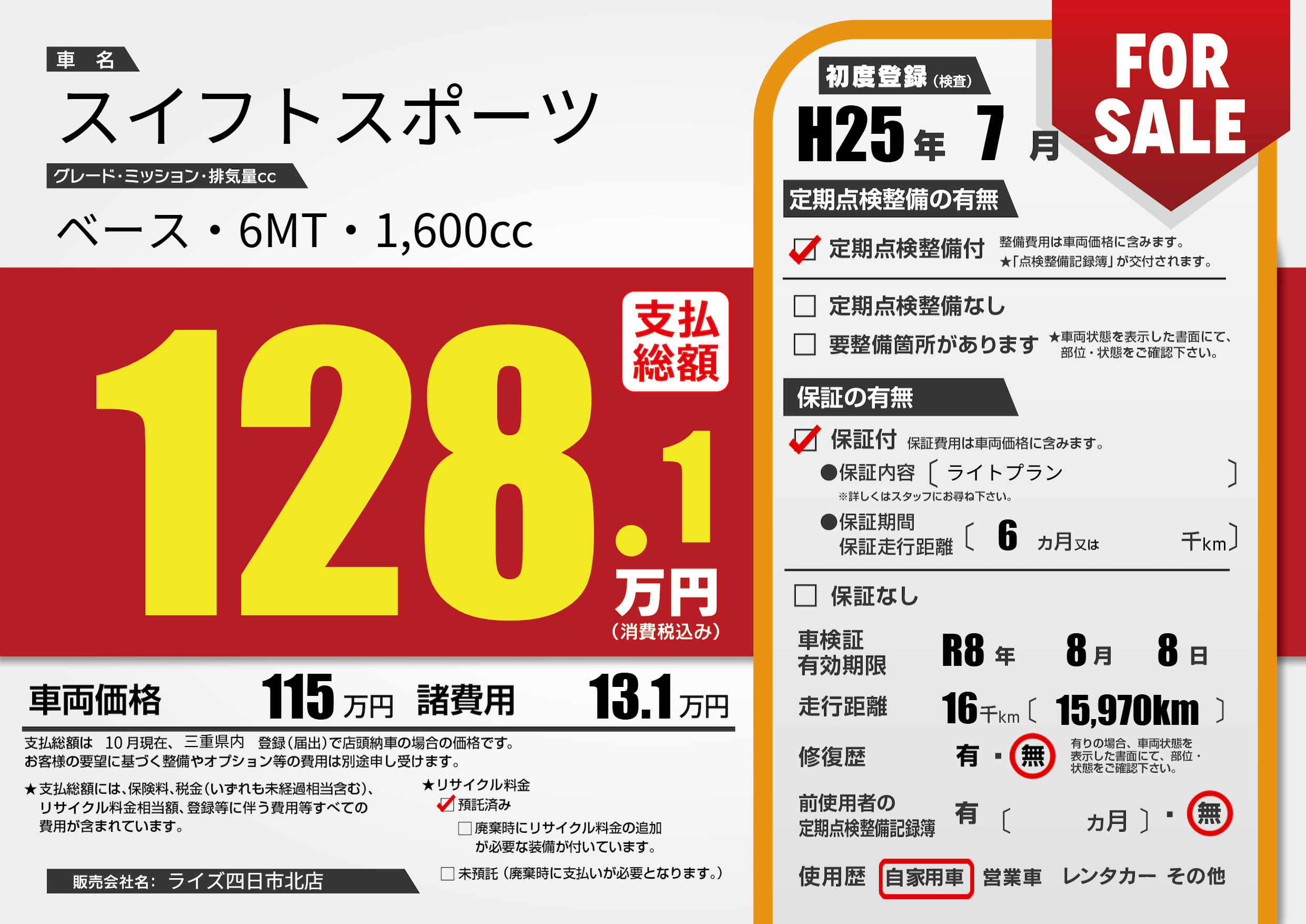 | 車名 | スイフトスポーツ | グレード ミッション 排気量 |