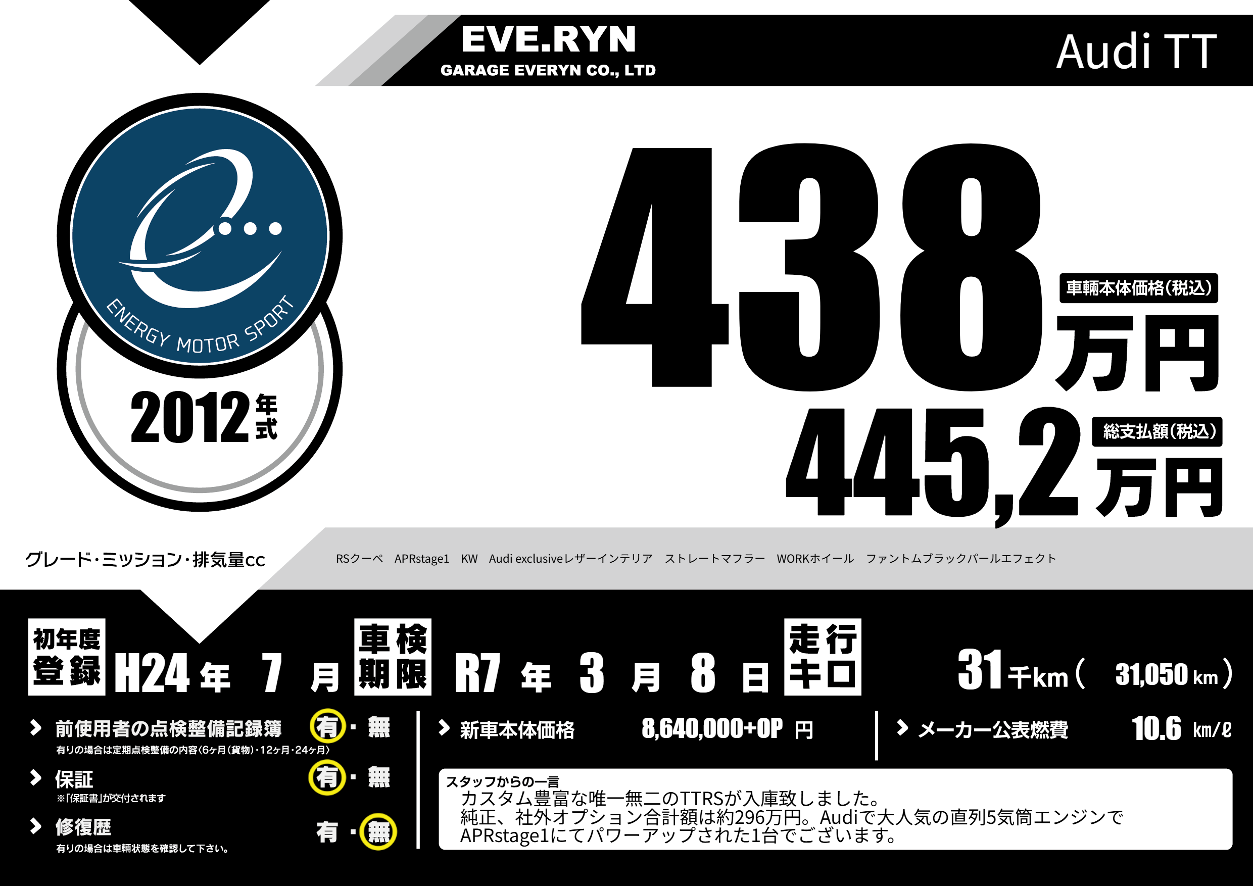 | 車名 | Audi TT | グレード ミッション 排気量 |
