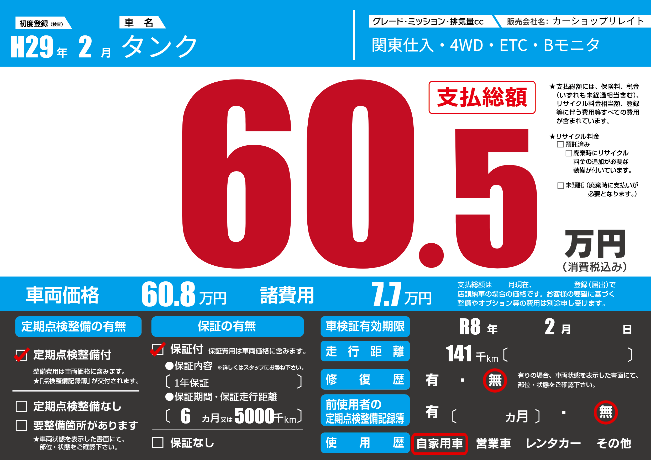 | 車検制限 | R8年 2月 - 日 | ||