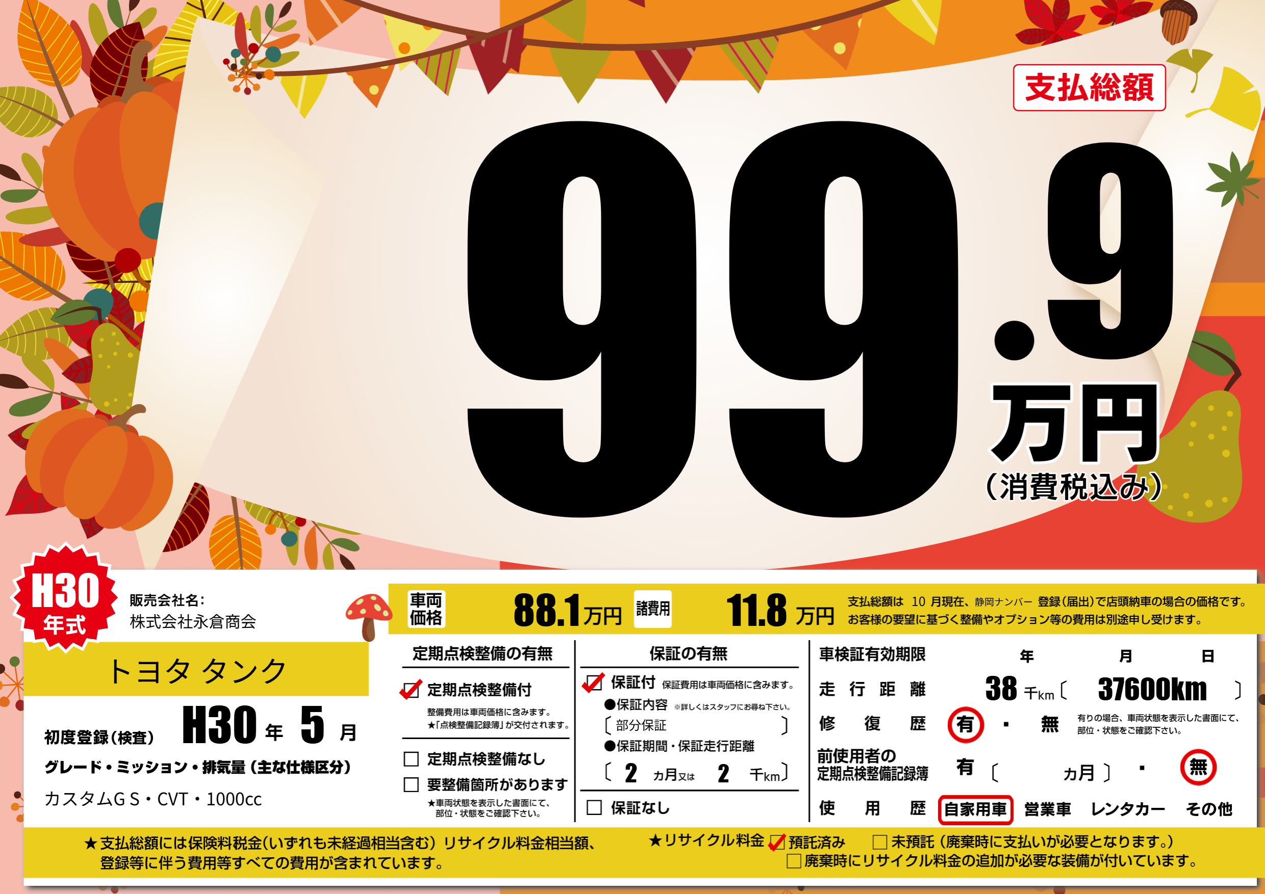 | 走行キロ | 3.8万km | 初年度登録 | H30年5月 |