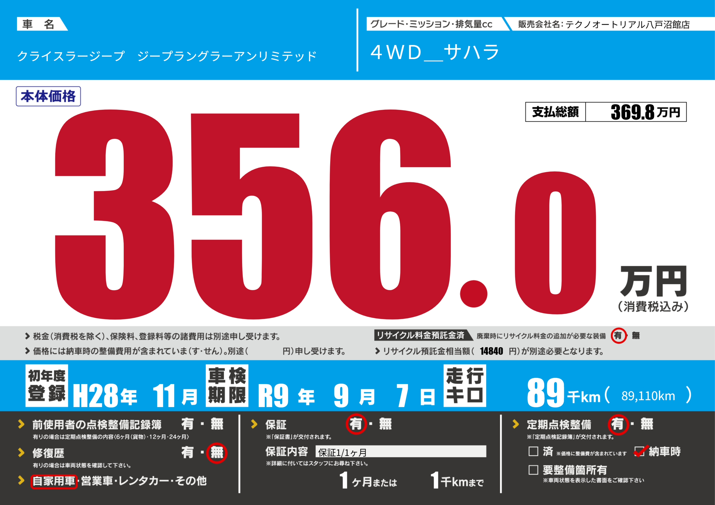 あり | リサイクル預託金相当額 | ( 14840円)が別途必要 |