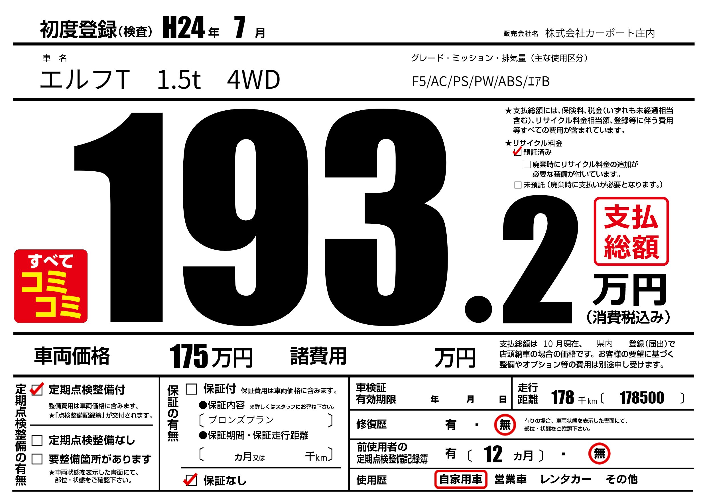 | 走行キロ | 17.8万km | 初年度登録 | H24年7月 |