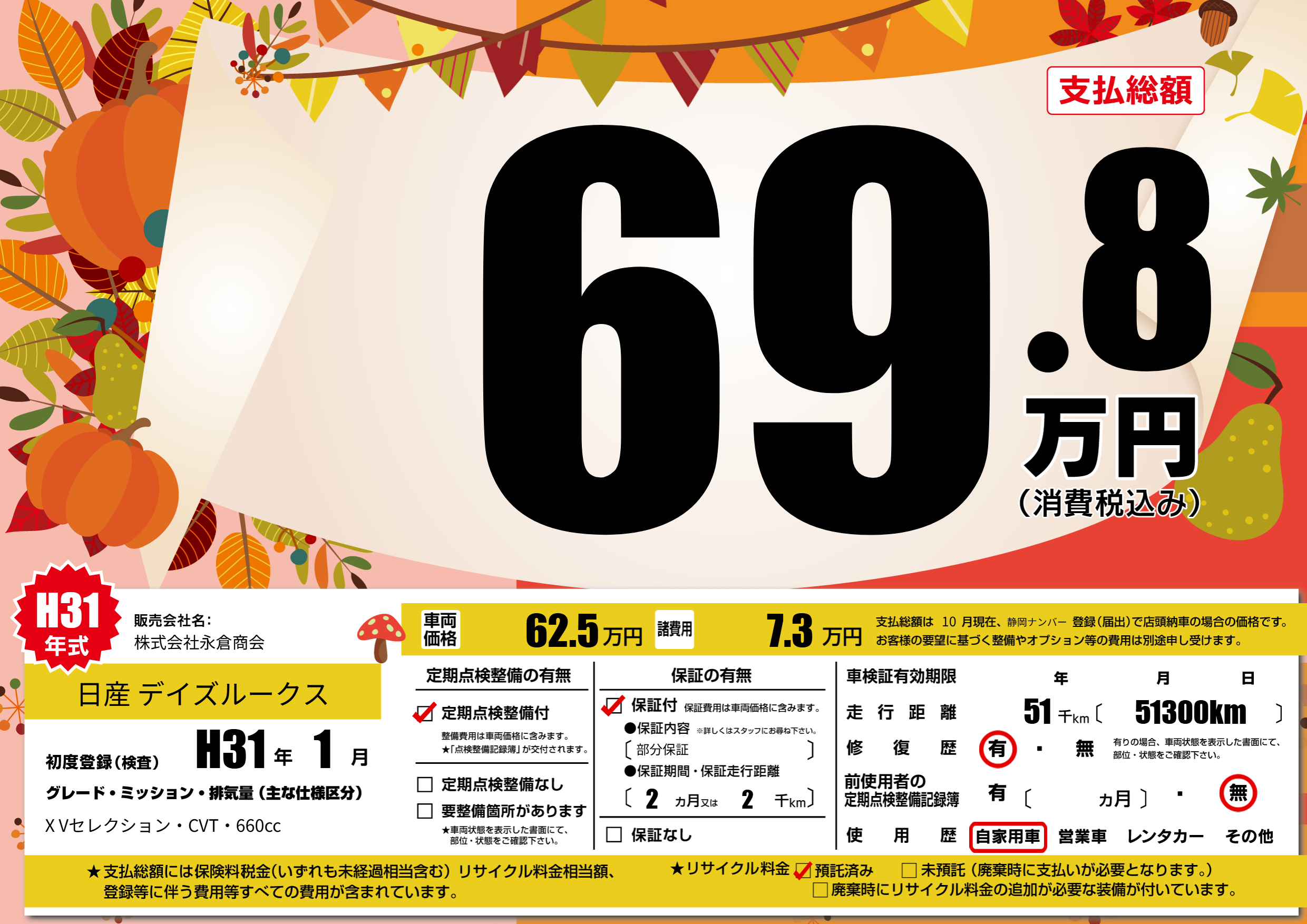 | 走行キロ | 5.1万km | 初年度登録 | H31年1月 |