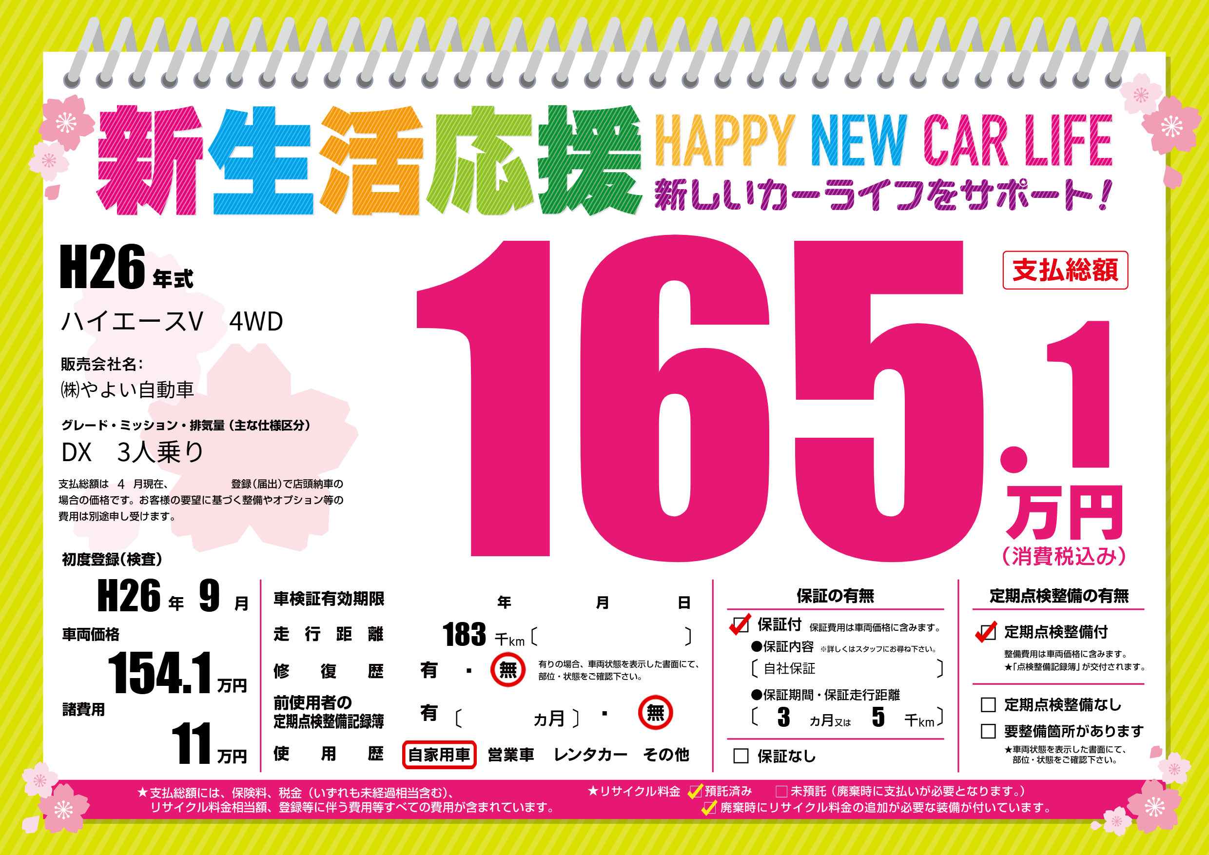 | 車名 | ハイエースV 4WD | グレード ミッション 排気量 |