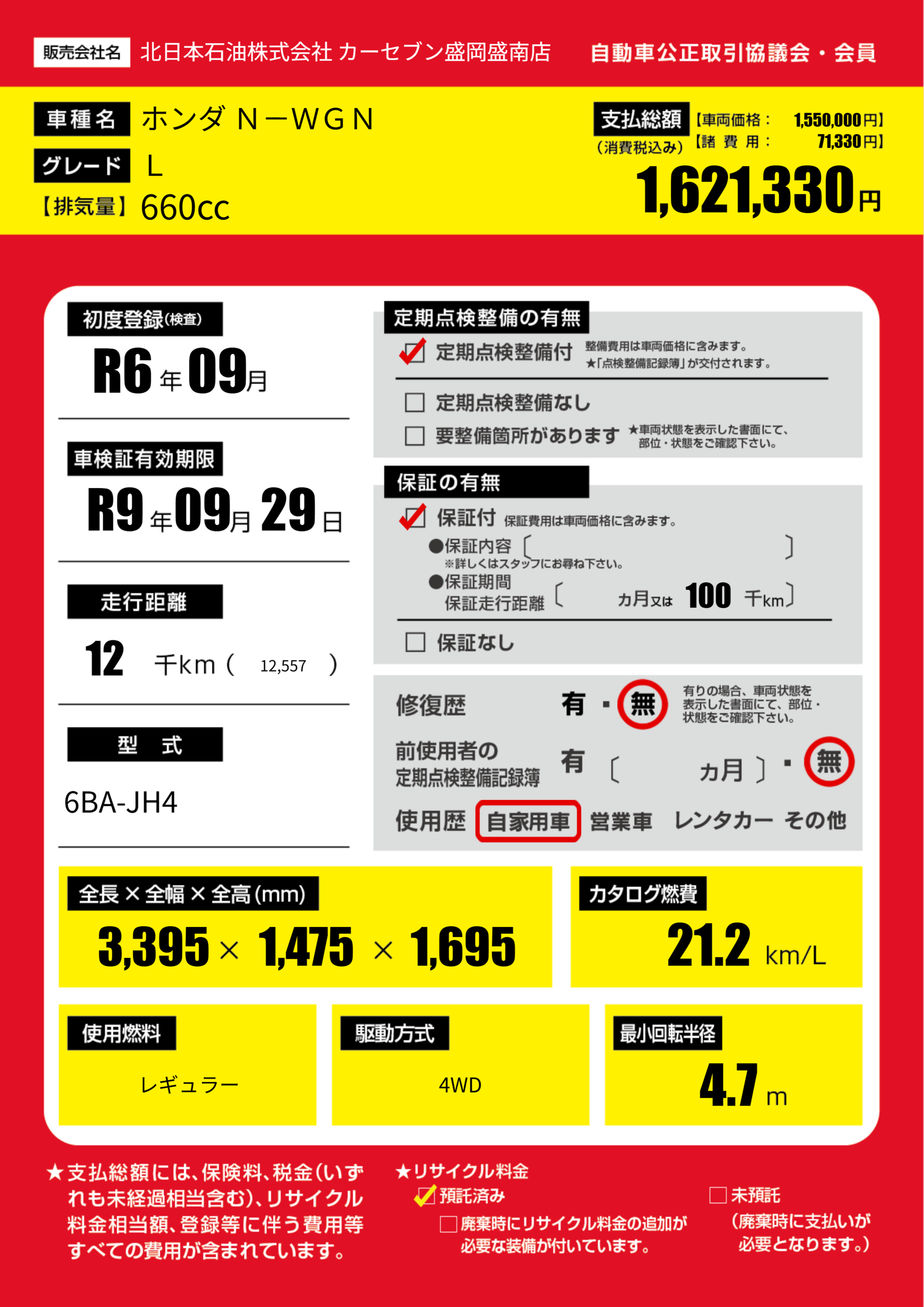 | 車名 | ホンダ N-WGN | グレード ミッション 排気量 |