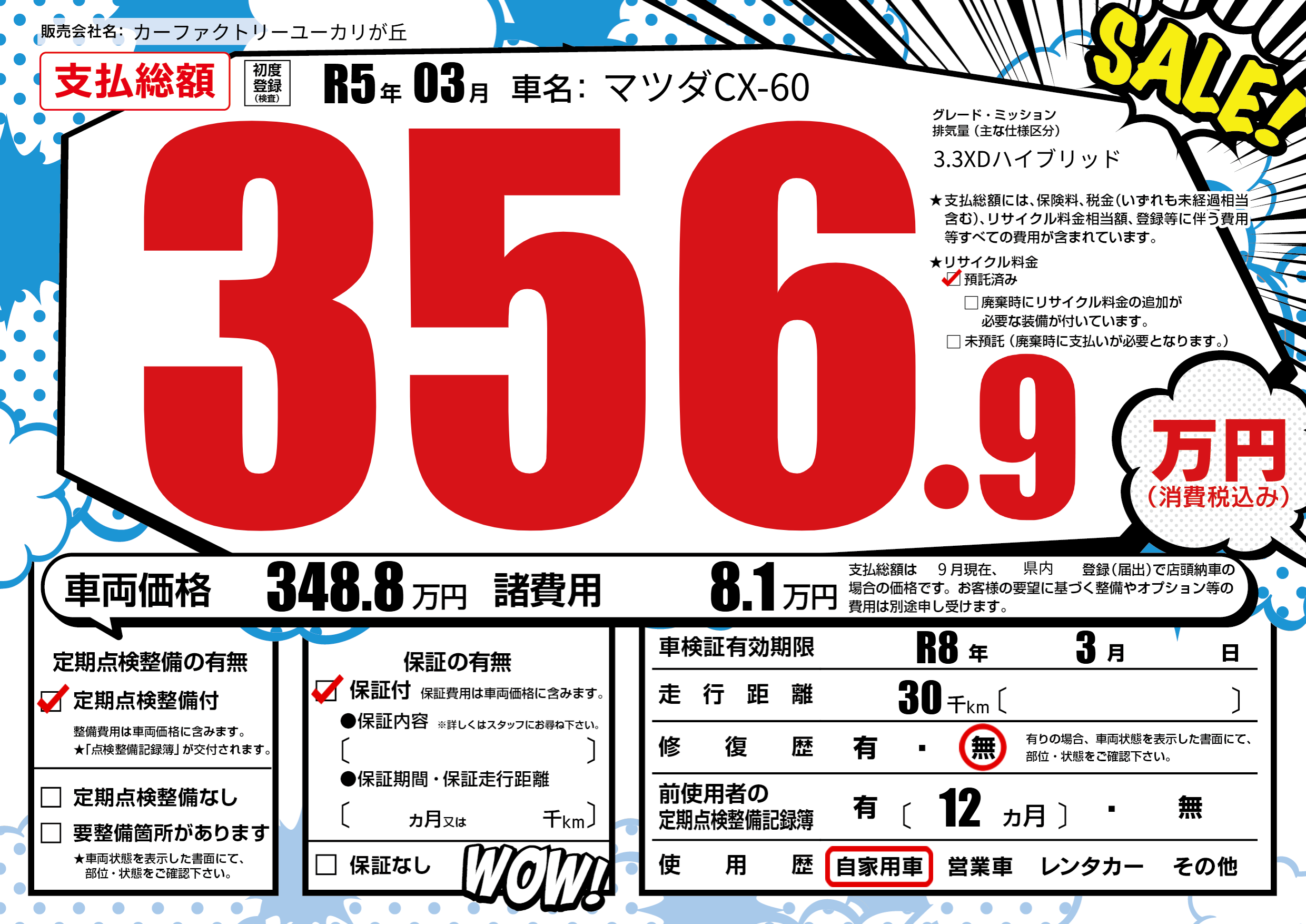 | 車名 | マツダCX-60 | グレード ミッション 排気量 |