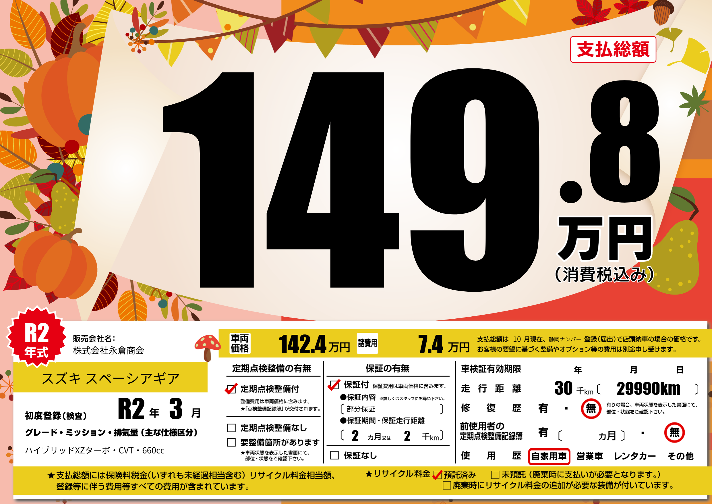 | 走行キロ | 3万km | 初年度登録 | R2年3月 |