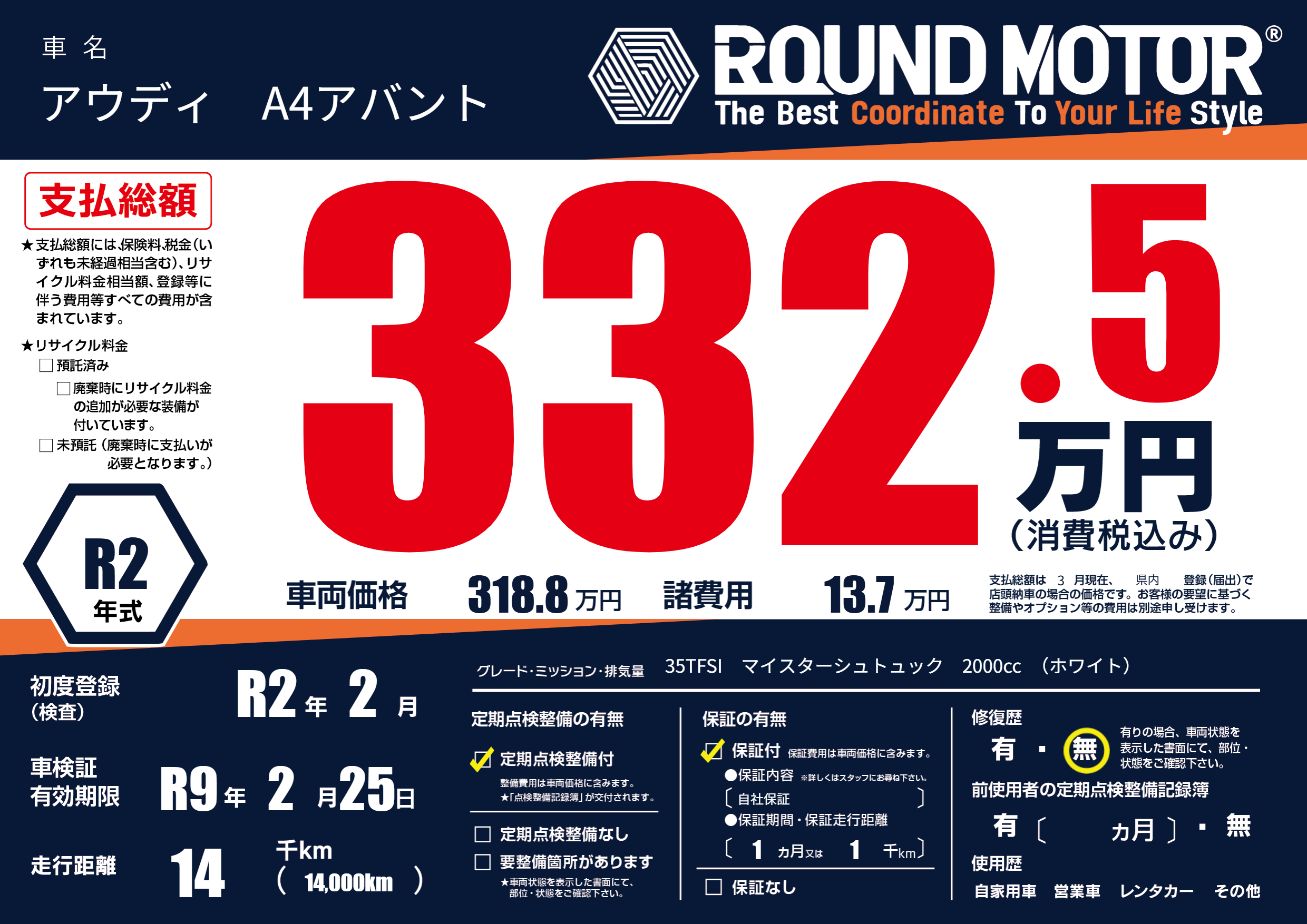 | 走行キロ | 1.4万km | 初年度登録 | R2年2月 |