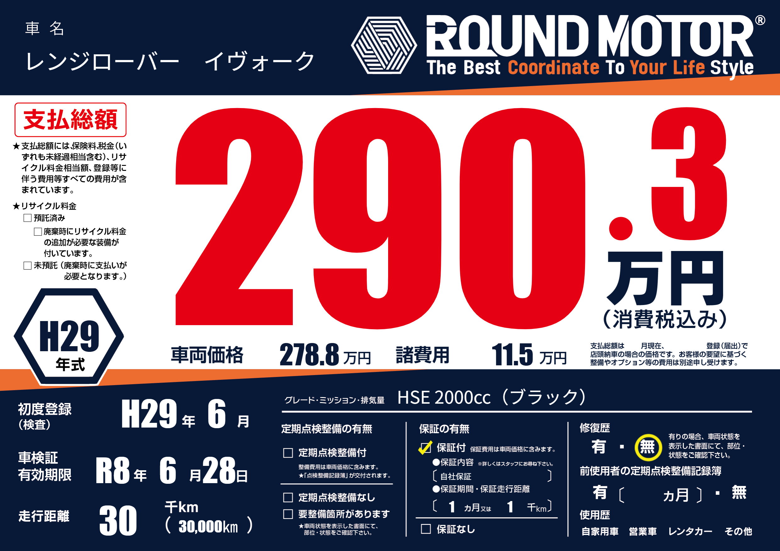 | 走行キロ | 3万km | 初年度登録 | H29年6月 |